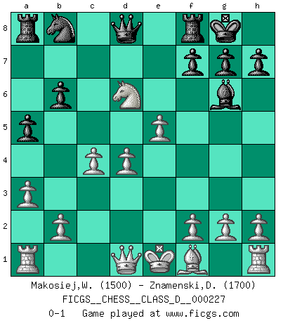 Last move : 0-1 2016 April 17 9:49:21 [Event "FICGS__CHESS__CLASS_D__000227"] [Site "FICGS"] [Date "2016.01.22"] [Round "1"] [White "Makosiej,Wladyslaw"] [Black "Znamenski,Dimitri"] [Result "0-1"] [WhiteElo "1500"] [BlackElo "1700"] 1.d4 d5 2.c4 e5 3.dxe5 d4 4.Nf3 Bb4+ 5.Bd2 a5 6.a3 Bxd2+ 7.Nbxd2 Nh6 8.Nb3 c5 9.Nxc5 b6 10.Ne4 O-O 11.Nxd4 Nf5 12.e3 Nxd4 13.exd4 Bf5 14.Nd6 Bg6 0-1 This chess game has been lost on time (started : 2016.01.22 17:11:3) QGD : Albin counter-gambit Kingside Castling by player Black (move 10) Player Black won this chess game. Follow this game move after move (download)In a gambit you give up a Pawn for the sake of getting a lost game. (Samuel Standige Boden) Fischer ist das größte Genie, das je vom Schachhimmel heruntergestiegen ist. (Mikhail Nekhemyevich Tal) El Peón aislado arroja penumbra sobre todo el tablero. (Aaron Nimzovich) Les échecs c'est le défi de l'alpiniste, toujours plus haut, prêt à tout pour monter à l'assaut du Roi ennemi. Les échecs, c'est de la musique en mouvement, un ballet majestueux pour les yeux. C'est de la poésie composée par les fantômes du passé qui au même titre que Rimbaud ou Verlaine méritent notre admiration. Les échecs, c'est de la peinture ou le moindre mouvement modifie le tableau pour en faire un Picasso ou un Van Gogh. Les échecs, c'est tout et rien, c'est la vie et la mort. Jjulie33 sur le forum de France-Echecs. Memory is a crazy woman that hoards colored rags and throws away food. (Austin O'Malley)