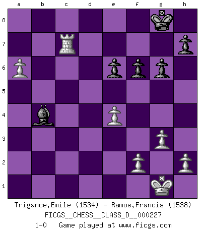 Last move : 1-0 2016 February 7 16:13:19 [Event "FICGS__CHESS__CLASS_D__000227"] [Site "FICGS"] [Date "2016.01.22"] [Round "1"] [White "Trigance,Emile"] [Black "Ramos,Francis"] [Result "1-0"] [WhiteElo "1534"] [BlackElo "1538"] 1.d4 Nf6 2.Bg5 d5 3.Bxf6 exf6 4.e3 Bd6 5.g3 O-O 6.Bg2 c6 7.Nd2 Na6 8.a3 Nc7 9.c4 dxc4 10.Nxc4 Be6 11.Qc2 Re8 12.Ne2 Bf8 13.Nf4 Rc8 14.Nxe6 Nxe6 15.O-O Nc7 16.Na5 Rb8 17.b4 Nd5 18.Rfd1 Qd6 19.Nc4 Qe6 20.e4 Nb6 21.Nxb6 axb6 22.d5 Qc8 23.dxc6 bxc6 24.Rd3 c5 25.bxc5 bxc5 26.Qc4 Rb2 27.Rad1 Qe6 28.Qc3 Reb8 29.Rd8 Rxd8 30.Rxd8 Rb1+ 31.Bf1 Qh3 32.Qd3 Rxf1+ 33.Qxf1 Qe6 34.Qd3 c4 35.Qd5 g6 36.Qxe6 fxe6 37.a4 c3 38.Rc8 Kf7 39.Rxc3 Bd6 40.a5 Bb4 41.Rc7+ Kg8 42.a6 1-0 Trompowsky attack (Ruth, Opovcensky Opening) Kingside Castling by player Black (move 5) Kingside Castling by player White (move 15) Player White won this chess game. Follow this game move after move (download)A chess genius has died; a loss for humanity. (Viktor Kortchnoi, about Bobby Fischer's death) Er war ein guter Schachspieler, aber ich kann Leute nicht ausstehen, die 'Heil Hitler' rufen (Über Alexander Aljechin). (Miguel Najdorf) Una clavada es mas poderosa que una espada. (Fred Reinfeld) Karpov est une pièce de musée. (Garry Kasparov) Life is pleasant. Death is peaceful. It's the transition that's troublesome. (Isaac Asimov)
