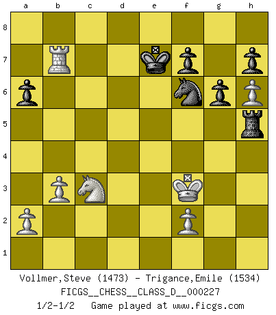 Last move : 1/2-1/2 2016 February 14 17:8:31 [Event "FICGS__CHESS__CLASS_D__000227"] [Site "FICGS"] [Date "2016.01.22"] [Round "1"] [White "Vollmer,Steve"] [Black "Trigance,Emile"] [Result "1/2-1/2"] [WhiteElo "1473"] [BlackElo "1534"] 1.Nf3 c6 2.c4 d5 3.cxd5 cxd5 4.d4 Nf6 5.g3 Bg4 6.Bg2 Bxf3 7.Bxf3 e6 8.O-O Nc6 9.Nc3 Qb6 10.e3 Be7 11.Bd2 O-O 12.h4 Rfd8 13.g4 Ne8 14.h5 Bf6 15.Kg2 Nd6 16.b3 a6 17.h6 g6 18.Bxd5 Nb5 19.Nxb5 Rxd5 20.Nc3 R5d8 21.Ne4 Bh8 22.g5 e5 23.Qf3 Ne7 24.Bc3 Nd5 25.Bb2 Re8 26.dxe5 Bxe5 27.Bxe5 Rxe5 28.Rfd1 Rf5 29.Qg3 Rd8 30.Rac1 Kf8 31.Rd4 Nf4+ 32.Kh2 Rxd4 33.exd4 Qxd4 34.Rc8+ Ke7 35.Nc3 Qe5 36.Qe3 Rxg5 37.Qxe5+ Rxe5 38.Kg3 Nh5+ 39.Kf3 Nf6 40.Rc7+ Ke8 41.Rxb7 Rh5 42.Rb8+ Ke7 43.Rb7+ 1/2-1/2 Reti Opening Kingside Castling by player White (move 8) Kingside Castling by player Black (move 11) This chess game ended in a draw. Follow this game move after move (download)The tactician knows what to do when there is something to do; whereas the strategian knows what to do when there is nothing to do. (Gerald Abrahams) Mit sehr nachdenklichem Gesicht schreitet Bobby durch den Turniersaal. Was ist passiert?, fragt Lombardy. Ich stehe schlecht, antwortet Fischer. Lombardy: Dann biete doch einfach Remis an. Fischer: So schlecht stehe ich nun auch wieder nicht! (Robert James Fischer) Con el tiempo, empecé a progresar en partidas decisivas. Tal vez porque me di cuenta de una simple verdad: no solo estaba yo nervioso sino también mi oponente. (Mikhail Tal) Même un GMI sait rarement calculer sur plus de cinq coups une attaque à sacrifices. (Rudolf Spielmann) Fear is the path to the dark side. Fear leads to anger; anger leads to hate; hate leads to suffering. I sense much fear in you. (Master Yoda in Star Wars ep.1)
