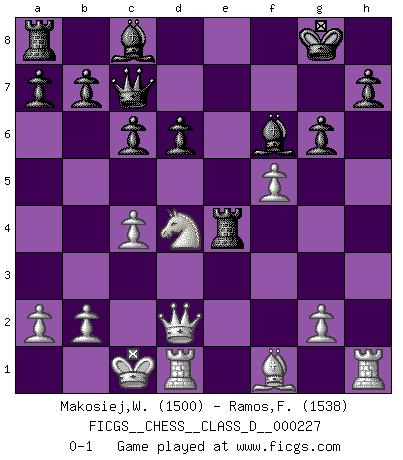 Last move : 0-1 2016 June 9 22:21:58 [Event "FICGS__CHESS__CLASS_D__000227"] [Site "FICGS"] [Date "2016.01.22"] [Round "1"] [White "Makosiej,Wladyslaw"] [Black "Ramos,Francis"] [Result "0-1"] [WhiteElo "1500"] [BlackElo "1538"] 1.d4 Nf6 2.c4 g6 3.Nc3 Bg7 4.e4 d6 5.f3 O-O 6.Be3 e5 7.Nge2 c6 8.Qd2 exd4 9.Nxd4 Qe7 10.O-O-O Rd8 11.Bg5 Qc7 12.f4 Na6 13.h4 Nc5 14.Bxf6 Bxf6 15.h5 Re8 16.hxg6 fxg6 17.f5 Nxe4 18.Nxe4 Rxe4 0-1 This chess game has been lost on time (started : 2016.01.22 17:11:3) King's Indian : Saemisch, Orthodox, 7.Nge2 c6 Kingside Castling by player Black (move 5) Queenside Castling by player White (move 10) Player Black won this chess game. Follow this game move after move (download)A sacrifice is best refuted by accepting it. (Wilhelm Steinitz) Die Arbeit ist etwas Unnatürliches. Die Faulheit allein ist göttlich. (Anatole France) Cada Peón es una Reina en potencia. (James Mason) Dans le domaine de la peinture, de la gravure et de la sculpture, dès la première décennie de notre siècle, les artistes abandonnent la représentation de la partie d'échecs pour se concentrer sur les pièces, sur les échiquiers et sur toutes les variations auxquelles les unes et les autres peuvent donner lieu. On passe en quelque sorte d'un thème social à un thème musical (au sens de la musica médiévale, c'est-à-dire d'une notion qui inclue le rythme, l'harmonie, la construction et la déconstruction, etc.). Graphiquement et picturalement, l'échiquier apparaît comme une structure ouverte, dynamique, d'une richesse infinie, autorisant toutes les combinatoires et débouchant sur des mouvements et des rythmes de nature exponentielle. (Michel Pastoureau) Unless in communicating with it one says exactly what one means, trouble is bound to result. (Alan Turing, about computers)
