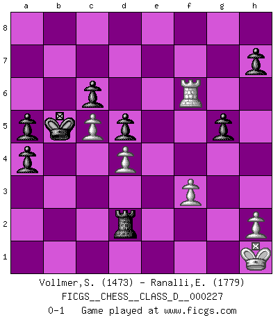 Last move : 0-1 2016 February 14 13:34:31 [Event "FICGS__CHESS__CLASS_D__000227"] [Site "FICGS"] [Date "2016.01.22"] [Round "1"] [White "Vollmer,Steve"] [Black "Ranalli,Emmanuel Eduardo"] [Result "0-1"] [WhiteElo "1473"] [BlackElo "1779"] 1.d4 d5 2.c4 c6 3.e3 Nf6 4.Nc3 Bg4 5.Be2 Bxe2 6.Qxe2 e6 7.Nf3 Bb4 8.O-O Bxc3 9.bxc3 Ne4 10.Bb2 Nd7 11.Rfc1 b5 12.cxd5 exd5 13.Ba3 Qa5 14.Qb2 f6 15.Bb4 Qa4 16.Qb3 a5 17.Qxa4 bxa4 18.Ba3 Nb6 19.Bc5 Nc4 20.Rab1 O-O-O 21.Bb6 Rde8 22.Bc5 Kc7 23.Ne1 Rb8 24.Ra1 Rb2 25.f3 Nxc5 26.dxc5 Nxe3 27.Nd3 Rxg2+ 28.Kh1 g5 29.Re1 Re8 30.Nc1 Rc2 31.Ne2 Nf5 32.Nd4 Rxe1+ 33.Rxe1 Nxd4 34.cxd4 Rxa2 35.Re7+ Kb8 36.Re6 Kb7 37.Re7+ Ka6 38.Re6 Kb5 39.Rxf6 Rd2 0-1 QGD Slav defense Kingside Castling by player White (move 8) Queenside Castling by player Black (move 20) Player Black won this chess game. Follow this game move after move (download)On the chessboard, lies and hypocrisy do not survive long. (Emanuel Lasker) Wer mein Gambit spielt, muß bereit sein, alle Brücken hinter sich abzubrechen. Es verändert den ganzen Menschen. Es wirkt wie ein Zauberstab und fördert verkümmerte, gute Charakter- eigenschaften wieder zu Tage. (Emil Joseph Diemer) A la fecha, Fischer esta simplemente un nivel arriba de todos los mejores jugadores de Ajedrez del mundo. (John Jacobs) Je crois qu'il existe des manières très spécifiques de jouer efficacement contre une machine. Evidemment, nous n'avons aucune chance en technique pure, parce que l'ordinateur calcule de manière parfaite. Mais lorsque nous faisons appel à notre cerveau, en utilisant l'intuition et la compréhension, alors nous restons beaucoup plus forts. (Anatoli Karpov) Pushing plastic is for the many, pushing virtual pieces is for the fewer, pushing wood is for the very few. (Normajean Yates)