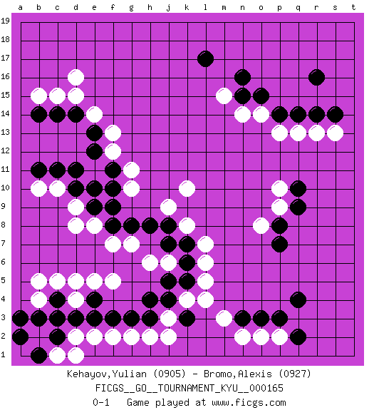 Last move : 0-1 2016 July 18 9:27:6 [Event "FICGS__GO__TOURNAMENT_KYU__000165"] [Site "FICGS"] [Date "2016.01.23"] [Round "1"] [Black "Kehayov,Yulian"] [White "Bromo,Alexis"] [Result "0-1"] [Rating 1 "0905"] [Rating 2 "0927"] 1.r16 d4 2.q4 d16 3.l17 k4 4.q10 k10 5.d10 c10 6.c11 d9 7.d11 f13 8.n3 m3 9.c14 c15 10.b14 b15 11.b11 b10 12.d14 d15 13.e13 e14 14.e12 f12 15.e10 n2 16.f10 g10 17.f9 e8 18.o15 n14 19.n15 m15 20.n16 o14 21.p14 p13 22.q14 q13 23.r14 r13 24.s14 s13 25.f8 f7 26.g8 g7 27.h8 j9 28.j8 k8 29.j7 j6 30.k7 l7 31.k6 l6 32.j5 h6 33.k5 l5 34.j4 j3 35.k3 l4 36.h3 j2 37.h4 h2 38.g3 g2 39.f3 f2 40.e3 e2 41.d3 d2 42.f11 g11 43.o3 o2 44.p3 p2 45.q2 c3 46.e4 e5 47.c4 d5 48.b3 c5 49.c2 b4 50.c3 b5 51.a3 c1 52.b1 d1 53.a2 f5 54.e9 d8 55.p7 o8 56.p8 p9 57.q9 p10 0-1 Here are the names of the openings (joseki) played in the four corners : Corner d16 : d16 c11 Hoshi (Hwajeom, Seongjeom, Xingwei`) 4-4 Point. The star or hoshi (4-4) point, emphasizing influence at the potential expense of territory. Player White won this Go (weiqi, baduk) game. Follow this game move after move (download)Do not fear furikawari. (Anonymous) The large trees attract high winds. (Chinese proverb)