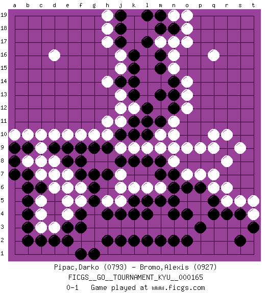 Last move : 0-1 2016 April 12 21:27:35 [Event "FICGS__GO__TOURNAMENT_KYU__000165"] [Site "FICGS"] [Date "2016.01.23"] [Round "1"] [Black "Pipac,Darko"] [White "Bromo,Alexis"] [Result "0-1"] [Rating 1 "0793"] [Rating 2 "0927"] 1.d4 q16 2.q4 d16 3.k10 d10 4.k16 q10 5.k5 k12 6.k13 j13 7.j14 h14 8.k15 j15 9.k14 j16 10.k11 j12 11.l12 j11 12.j10 h10 13.j17 h17 14.j18 h18 15.j19 h19 16.l17 m17 17.m16 n16 18.m18 n17 19.m15 n15 20.n18 o18 21.n14 o14 22.n13 o13 23.n12 o12 24.l19 n11 25.m11 m10 26.l10 n10 27.h9 h11 28.g9 g10 29.f9 f10 30.e9 e10 31.d9 c9 32.c8 b8 33.b9 c10 34.b7 b10 35.a8 l9 36.l8 j9 37.j8 k9 38.l11 m9 39.m13 n19 40.m19 o19 41.m8 o17 42.k8 n8 43.n7 o7 44.o6 p7 45.p6 q6 46.q5 r5 47.r4 s5 48.s4 r6 49.o4 h3 50.h2 j3 51.j2 k3 52.k2 l3 53.l2 m3 54.m2 n3 55.n2 o3 56.p3 g4 57.o2 g2 58.h4 h5 59.j4 j5 60.k4 k6 61.l5 l6 62.m5 m6 63.n6 j6 64.n4 m4 65.n5 h8 66.m7 j7 67.g5 f5 68.g6 f6 69.g7 g8 70.f7 e7 71.e8 d7 72.h7 d8 73.f8 c7 74.b6 b8 75.a9 c8 76.f4 g3 77.f3 f2 78.e2 e4 79.e3 e5 80.d5 e6 81.c6 a10 82.a7 d3 83.d2 c3 84.c2 c4 85.b4 c5 86.b5 d6 87.b3 t4 88.t3 t5 89.o8 n9 90.p8 q7 91.q8 r8 92.r9 q9 93.b2 o9 94.s2 p9 95.f1 s9 96.g1 r10 97.l4 pass 0-1 Here are the names of the openings (joseki) played in the four corners : Corner q16 : q16 l12 Hoshi (Hwajeom, Seongjeom, Xingwei`) 4-4 Point. The star or hoshi (4-4) point, emphasizing influence at the potential expense of territory. Corner q4 : q4 l9 Hoshi (Hwajeom, Seongjeom, Xingwei`) 4-4 Point. The star or hoshi (4-4) point, emphasizing influence at the potential expense of territory. Player White won this Go (weiqi, baduk) game. Follow this game move after move (download)Don't count territory held by only one eye. (Anonymous) Strategy without tactics is the slowest route to victory. Tactics without strategy is the noise before defeat. (Sun Tzu)