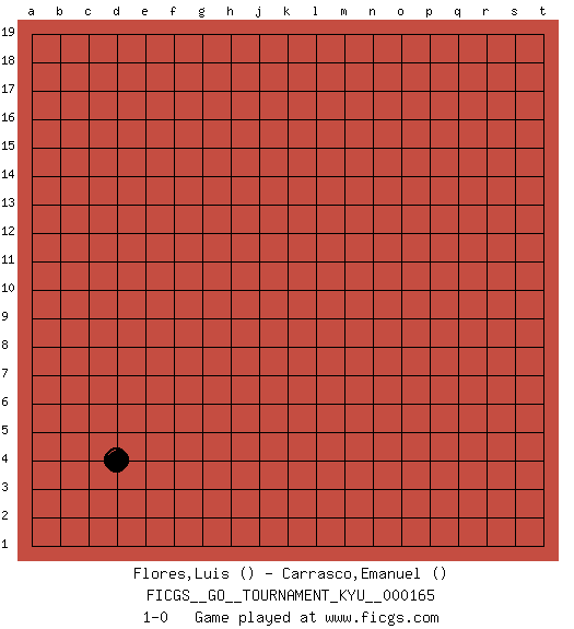 Last move : 1-0 2016 February 22 15:55:51 [Event "FICGS__GO__TOURNAMENT_KYU__000165"] [Site "FICGS"] [Date "2016.01.23"] [Round "1"] [Black "Flores,Luis"] [White "Carrasco,Emanuel"] [Result "1-0"] 1.d4 1-0 This go game has been lost on time (started : 2016.01.23 9:39:39) Here are the names of the openings (joseki) played in the four corners : Corner d4 : d4 1-0 Hoshi (Hwajeom, Seongjeom, Xingwei`) 4-4 Point. The star or hoshi (4-4) point, emphasizing influence at the potential expense of territory. Player Black won this Go (weiqi, baduk) game. Follow this game move after move (download)On the second line six die, eight live. (Anonymous) All politicians must be presumed guilty until they are proven innocent. (Dinesh De Silva)