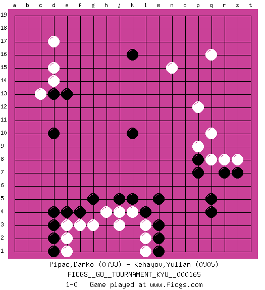Last move : 1-0 2016 March 21 18:54:9 [Event "FICGS__GO__TOURNAMENT_KYU__000165"] [Site "FICGS"] [Date "2016.01.23"] [Round "1"] [Black "Pipac,Darko"] [White "Kehayov,Yulian"] [Result "1-0"] [Rating 1 "0793"] [Rating 2 "0905"] 1.d4 q16 2.q4 d17 3.k16 k4 4.l4 h4 5.k5 j4 6.m5 l3 7.m3 l2 8.m2 l1 9.m1 j3 10.j5 c13 11.e4 f3 12.f4 e3 13.d3 e2 14.d2 e1 15.d1 g3 16.g5 p12 17.d10 r8 18.k10 q10 19.p8 q8 20.q5 p9 21.p7 n15 22.d13 d14 23.e13 d15 24.r7 s8 25.s7 1-0 This go game has been lost on time (started : 2016.01.23 9:39:39) Here are the names of the openings (joseki) played in the four corners : Corner d4 : d4 h4 Hoshi (Hwajeom, Seongjeom, Xingwei`) 4-4 Point. The star or hoshi (4-4) point, emphasizing influence at the potential expense of territory. Player Black won this Go (weiqi, baduk) game. Follow this game move after move (download)The possibility or impossibility of an event results logically from the rules. (Pierre Audouard) Ah, beer! The cause of, and the solution to, all of life's problems. (Homer Simpson)