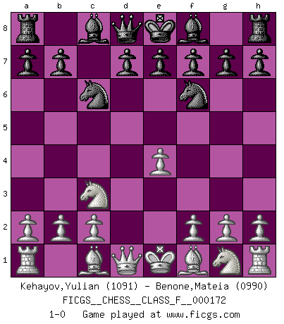 Last move : 1-0 2016 March 10 18:6:43 [Event "FICGS__CHESS__CLASS_F__000172"] [Site "FICGS"] [Date "2016.01.23"] [Round "1"] [White "Kehayov,Yulian"] [Black "Benone,Mateia"] [Result "1-0"] [WhiteElo "1091"] [BlackElo "0990"] 1.e4 c5 2.d4 cxd4 3.Qxd4 Nc6 4.Qd1 Nf6 5.Nc3 1-0 This chess game has been lost on time (started : 2016.01.23 9:41:19) Sicilian : Smith-Morra gambit Player White won this chess game. Follow this game move after move (download)When asked, -How is that you pick better moves than your opponents?, I responded: I'm very glad you asked me that, because, as it happens, there is a very simple answer. I think up my own moves, and I make my opponent think up his. (Alexander Alekhine) Irgendwie scheint mir sonntags früh um 9 Uhr der Killerinstinkt verloren gegangen zu sein. (Alexej Shirov) Un jugador que es sorprendido, esta derrotado a medias. (Proverbio) Les pièces de l'échiquier étaient impitoyables. Elles le retenaient, elles l'absorbaient. Il y avait de l'horreur en cela, mais aussi une harmonie unique. Car, qu'y a-t-il dans le monde, à part les échecs ? (V. Nabokov) Life is the sum of all your choices. (Albert Camus)