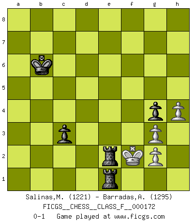 Last move : 0-1 2016 October 29 19:11:9 [Event "FICGS__CHESS__CLASS_F__000172"] [Site "FICGS"] [Date "2016.01.23"] [Round "1"] [White "Salinas,Marcelo"] [Black "Barradas,Anderson"] [Result "0-1"] [WhiteElo "1221"] [BlackElo "1295"] 1.e4 e5 2.Qh5 Nc6 3.Bc4 Qe7 4.d3 g6 5.Qf3 Nd4 6.Qd1 h5 7.Nf3 d5 8.Bb5+ Nxb5 9.Bg5 Nf6 10.exd5 Bh6 11.Bh4 Bg4 12.h3 Bxf3 13.Qxf3 g5 14.Bg3 Nd4 15.Qd1 O-O-O 16.c3 Nf5 17.O-O Nxd5 18.Qa4 Nxg3 19.fxg3 Qc5+ 20.d4 exd4 21.cxd4 Qb6 22.Rf2 g4 23.Nc3 Be3 24.Nxd5 Rxd5 25.Qb3 Qxd4 26.Raf1 Bxf2+ 27.Rxf2 Qd1+ 28.Qxd1 Rxd1+ 29.Kh2 Rh7 30.h4 b6 31.b3 Kd7 32.b4 a5 33.bxa5 bxa5 34.a4 Rd4 35.Ra2 c5 36.Kg1 f5 37.Kf2 Re7 38.Ra3 c4 39.Rc3 Kc6 40.Kf1 Kc5 41.Rc2 Kb4 42.Rb2+ Kxa4 43.Ra2+ Kb5 44.Rb2+ Ka6 45.Kf2 a4 46.Re2 Rde4 47.Rd2 R7e6 48.Rd5 Re2+ 49.Kg1 a3 50.Rxf5 Re1+ 51.Kh2 a2 52.Rxh5 a1Q 53.Ra5+ Kb6 54.Rxa1 R1e3 55.Kg1 Re2 56.Kf1 c3 57.Re1 Rxe1+ 58.Kf2 R6e2+ 0-1 Variation Patzer Opening : Patzer Opening Queenside Castling by player Black (move 15) Kingside Castling by player White (move 17) Promotion Queen by player Black (move 52) 10 pieces endgame at move 54 : White KRPPP , Black KRRPP WHITE : King + 1 Rook 3 Pawns BLACK : King + 2 Rooks 2 Pawns 9 pieces endgame at move 57 : White KPPP , Black KRRPP WHITE : King + 3 Pawns BLACK : King + 2 Rooks 2 Pawns Player Black won this chess game. Follow this game move after move (download)The most powerful weapon in Chess is to have the next move. (David Bronstein) Wie, soll nun auch die Opposition abgeschafft werden? Ja, es tut mir leid, Ihnen diesen Schmerz nicht ersparen zu können. (Aaron Nimzowitsch) No hay precio que sea tan grande por la cabellera del Rey enemigo. (Koblentz) Il s'avisa de me proposer d'apprendre les échecs qu'il jouait un peu... me voilà forcené des échecs. J'achète un échiquier, je m'enferme dans ma chambre, j'y passe des jours et des nuits à vouloir apprendre par cur toutes les parties. (Jean-Jacques Rousseau, Confessions) Watch your thoughts; they become words. Watch your words; they become actions. Watch your actions; they become habits. Watch your habits; they become character. Watch your character; it becomes your destiny. (Frank Outlaw)