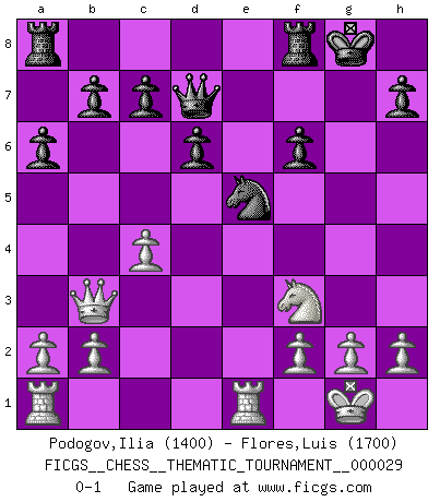 Last move : 0-1 2007 June 28 21:10:56 [Event "FICGS__CHESS__THEMATIC_TOURNAMENT__000029"] [Site "FICGS"] [Date "2007.03.20"] [Round "1"] [White "Podogov,Ilia"] [Black "Flores,Luis"] [Result "0-1"] [WhiteElo "1400"] [BlackElo "1700"] 1.e4 e6 2.d4 f5 3.Nc3 fxe4 4.Nxe4 Nf6 5.Nxf6+ Qxf6 6.Nf3 d6 7.Bb5+ Bd7 8.Bg5 Qf7 9.Qd3 Be7 10.O-O O-O 11.Rfe1 Bf6 12.Bxf6 gxf6 13.c4 Nc6 14.Qb3 a6 15.Ba4 e5 16.dxe5 Nxe5 17.Bxd7 Qxd7 0-1 French defense Kingside Castling by player White (move 10) Kingside Castling by player Black (move 10) Player Black won this chess game. Follow this game move after move (download)The battle for the ultimate truth will never be won. And that's why Chess is so fascinating. (Hans Kmoch) Die Jungen erwarten, dass Opa einfach umfällt. Dann aber kann Opa fünf Stunden lang Schach spielen und die jungen Gegner an die Wand drücken. (Viktor Kortschnoi) Existen dos clases de sacrificios: los correctos y los míos. (Mikhail Tal) Ce qui est bien, c'est d'avoir tout un tas de pièces en prise : l'adversaire ne peut en prendre qu'une à la fois. Cité par Thierry Audin. Without deviation from the norm, progress is not possible. (Frank Zappa)