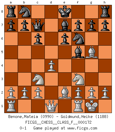 Last move : 0-1 2016 March 5 5:39:5 [Event "FICGS__CHESS__CLASS_F__000172"] [Site "FICGS"] [Date "2016.01.23"] [Round "1"] [White "Benone,Mateia"] [Black "Goldmund,Heike"] [Result "0-1"] [WhiteElo "0990"] [BlackElo "1188"] 1.e4 d5 2.exd5 Qxd5 3.Nc3 Qa5 4.d4 Nf6 5.Nf3 Bf5 6.Bd2 c6 7.Be2 e6 8.O-O Qc7 9.Bg5 Be7 0-1 This chess game has been lost on time (started : 2016.01.23 9:41:19) Scandinavian defense Kingside Castling by player White (move 8) Player Black won this chess game. Follow this game move after move (download)Fischer, who may or may not be mad as a hatter, has every right to be horrified. (Jeremy Silman) Darum geht es im Schach. Einen Tag gibst du deinem Gegner eine Lektion, am nächsten Tag gibt er dir eine. (Robert James Fischer) Un Peón pasado es un criminal, quién debe ser mantenido bajo candado y llave. Leves medidas, tales como vigilancia policiaca, no son suficientes. (Aaron Nimzovich) A chaque perte on perd un peu de soi. (Joël Lautier) Computers make it easier to do a lot of things, but most of the things they make it easier to do don't need to be done. (Andy Rooney)