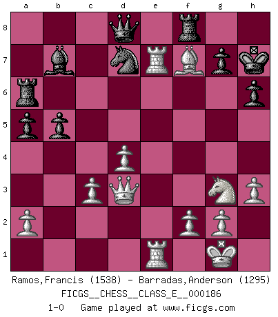 Last move : 1-0 2016 February 6 15:21:9 [Event "FICGS__CHESS__CLASS_E__000186"] [Site "FICGS"] [Date "2016.01.27"] [Round "1"] [White "Ramos,Francis"] [Black "Barradas,Anderson"] [Result "1-0"] [WhiteElo "1538"] [BlackElo "1295"] 1.e4 e5 2.Nf3 Nc6 3.Bb5 a6 4.Ba4 b5 5.Bb3 Nf6 6.O-O Bc5 7.c3 O-O 8.Re1 Ng4 9.Rf1 Kh8 10.h3 Nf6 11.Re1 h6 12.d3 d6 13.Nbd2 Ne7 14.Nf1 Ng6 15.Ng3 c6 16.Be3 Bb6 17.Qd2 Bxe3 18.Rxe3 d5 19.exd5 cxd5 20.Nxe5 d4 21.Re2 Nxe5 22.Rxe5 dxc3 23.bxc3 Nd7 24.Rh5 Nf6 25.Re5 Bb7 26.Rae1 a5 27.d4 Nd7 28.Re7 Kh7 29.Bxf7 Ra6 30.Qd3+ 1-0 Ruy Lopez : Caro variation Kingside Castling by player White (move 6) Kingside Castling by player Black (move 7) Player White won this chess game. Follow this game move after move (download)Chess mastery essentially consists of analyzing Chess positions accurately. (Mikhail Botvinnik) Man kann eine Schachpartie nur gewinnen, wenn das Gleichgewicht gestört ist. In einer Stellung mit ungestörtem Gleichgewicht ist auch das größte Genie hilflos - in der Stellung steckt dann eben kein genialer Einfall. (Wilhelm Steinitz) Todavía soy una víctima del Ajedrez. Tiene toda la belleza del arte y mucho mas. No puede ser comercializado. El Ajedrez es mas puro que el arte en su posición social. (Marcel Duchamp) Les échecs sont utiles à l'exercice de la faculté de penser et à celle de l'imagination. Car nous devons posséder une méthode élaborée pour atteindre des buts partout où nous devons conduire notre raison. (Leibnitz) No man has ever achieved immortality in his own life time. (Unknown)