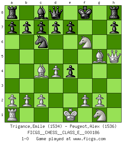 Last move : 1-0 2016 February 5 17:56:46 [Event "FICGS__CHESS__CLASS_E__000186"] [Site "FICGS"] [Date "2016.01.27"] [Round "1"] [White "Trigance,Emile"] [Black "Peugeot,Alex"] [Result "1-0"] [WhiteElo "1534"] [BlackElo "1536"] 1.d4 f5 2.e4 fxe4 3.Nc3 Nf6 4.Bg5 g6 5.h4 Bg7 6.h5 Nxh5 7.Rxh5 gxh5 8.Qxh5+ Kf8 9.Nd5 Nc6 10.Bc4 Bf6 11.Nxf6 1-0 Dutch : Staunton gambit, Alekhine variation Player White won this chess game. Follow this game move after move (download)Some part of a mistake is always correct. (Savielly Tartakover) Schach sollte überall auf der Welt Schulfach werden. Es fördert die geistige Auseinandersetzung. Es lehrt die Demut in der Niederlage. (Garry Kasparov) El jugador táctico debe saber que hacer cuando algo se debe de hacer. El estratégico debe saber que hacer cuando nada se debe de hacer. (Savielly Tartakover) Les Echecs sont affaire de jugement sensible. Savoir quand frapper et quand esquiver. (Fischer) My poor ole parrot... Is not in the circulation of displays ....poo hoo hoo :) (Wayne Lowrance's enigma)