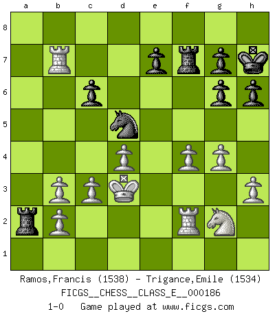 Last move : 1-0 2016 February 3 15:38:42 [Event "FICGS__CHESS__CLASS_E__000186"] [Site "FICGS"] [Date "2016.01.27"] [Round "1"] [White "Ramos,Francis"] [Black "Trigance,Emile"] [Result "1-0"] [WhiteElo "1538"] [BlackElo "1534"] 1.e4 c6 2.d4 d5 3.Nc3 dxe4 4.Nxe4 Nd7 5.Ng5 Ngf6 6.Bd3 h6 7.Ne6 Qb6 8.Nxf8 Nxf8 9.Nf3 Bg4 10.c3 Ne6 11.h3 Bh5 12.g4 Bg6 13.Bxg6 fxg6 14.Qb3 Qxb3 15.axb3 Nd7 16.Ke2 O-O 17.Nh4 Kh7 18.Re1 Nf4+ 19.Bxf4 Rxf4 20.Ng2 Rf7 21.f4 Raf8 22.Rxa7 Nb6 23.Rxb7 Nd5 24.Rf1 Ra8 25.Rf2 Ra2 26.Kd3 1-0 Caro-Kann : Steinitz variation Kingside Castling by player Black (move 16) Player White won this chess game. Follow this game move after move (download)In Chess, just as in life, today's bliss may be tomorrow's poison. (Assaic) Verschiedene, sehr schätzbare und im Laufe des Lebens nützliche Eigenschaften des Geistes können durch das Schachspiel erworben und gekräftigt werden, so dass sie zu Gewohnheiten werden, die uns nie im Stich lassen. (Benjamin Franklin) Vive, pierde y aprende al observar a tu oponente como ganar. (Amber Steenbock) Même un GMI sait rarement calculer sur plus de cinq coups une attaque à sacrifices. (Rudolf Spielmann) Train yourself to let go of everything you fear to lose. (Master Yoda in Star Wars ep.3)