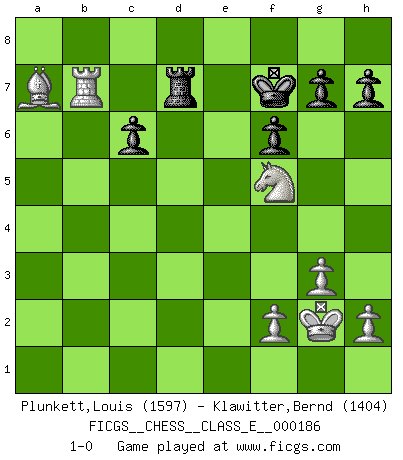 Last move : 1-0 2016 March 11 10:13:22 [Event "FICGS__CHESS__CLASS_E__000186"] [Site "FICGS"] [Date "2016.01.27"] [Round "1"] [White "Plunkett,Louis"] [Black "Klawitter,Bernd"] [Result "1-0"] [WhiteElo "1597"] [BlackElo "1404"] 1.c4 e5 2.g3 c6 3.d4 exd4 4.Qxd4 Nf6 5.Bg2 Bb4+ 6.Nc3 Bxc3+ 7.bxc3 O-O 8.Bg5 c5 9.Qxc5 Nc6 10.Qe3 Re8 11.Bxf6 Rxe3 12.Bxd8 Rxc3 13.Bxc6 dxc6 14.Bg5 Be6 15.Nf3 Bxc4 16.O-O Bxe2 17.Nh4 Bxf1 18.Rxf1 f6 19.Be3 Rd3 20.Ng2 Rd7 21.Nf4 Kf7 22.Ne2 Rad8 23.Bxa7 Ra8 24.Be3 Rxa2 25.Nd4 Rd5 26.Rb1 Rd7 27.Nf5 Ra5 28.Rxb7 Ra1+ 29.Kg2 Ra7 30.Bxa7 1-0 English Opening Kingside Castling by player Black (move 7) Kingside Castling by player White (move 16) Player White won this chess game. Follow this game move after move (download)Of Chess it has been said that life is not long enough for it, but that is the fault of life, not Chess. (William Ewart Napier) Als ich elf wurde, wurde ich einfach gut. (Robert James Fischer) Robert Fischer es la ley hacia si mismo. (Larry Evans) Echiquier : carré parfait, comme la Jérusalem nouvelle décrite par l'auteur de l'Apocalypse, huit cases sur huit, exaltation du chiffre 4, symbole du cosmos aux quatre horizons... où le noir et le blanc, l'ombre et la lumière, le mal et le bien s'entremêlent et se conjuguent. (Robert Couffignal, Le Gambit du poète) Tree pose grows confidence. It roots me to this world. (Terri Guillemets)