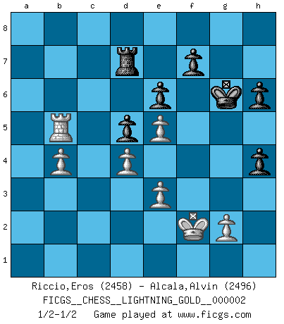 Last move : 1/2-1/2 2016 January 28 17:18:21 [Event "FICGS__CHESS__LIGHTNING_GOLD__000002"] [Site "FICGS"] [Date "2016.01.28"] [Round "1"] [White "Riccio,Eros"] [Black "Alcala,Alvin"] [Result "1/2-1/2"] [WhiteElo "2458"] [BlackElo "2496"] 1.d4 d5 2.c4 c6 3.cxd5 cxd5 4.Bf4 Nc6 5.e3 Nf6 6.Nc3 a6 7.Nf3 Bg4 8.h3 Bxf3 9.Qxf3 e6 10.Bd3 Nb4 11.Bb1 Bd6 12.Bg5 h6 13.Bh4 Be7 14.O-O Rc8 15.Rc1 O-O 16.a3 Nc6 17.Bd3 Na5 18.Qd1 Bd6 19.Ne2 Nc4 20.Rc2 g5 21.Bg3 Qe7 22.Rac1 Bxg3 23.Nxg3 Nd6 24.Nh5 Nxh5 25.Qxh5 Kg7 26.b4 Rxc2 27.Rxc2 Rc8 28.Rc5 Rc7 29.h4 gxh4 30.Qe5+ Kg8 31.Qf4 Kg7 32.a4 Rd7 33.Qe5+ Qf6 34.f4 b5 35.axb5 axb5 36.Bxb5 Nxb5 37.Rxb5 Qxe5 38.fxe5 Kg6 39.Kf2 1/2-1/2 QGD Slav defense : Exchange variation Kingside Castling by player White (move 14) Kingside Castling by player Black (move 15) This chess game ended in a draw. Follow this game move after move (download)You cannot play at Chess if you are kind-hearted. (French Proverb) Darum geht es im Schach. Einen Tag gibst du deinem Gegner eine Lektion, am nächsten Tag gibt er dir eine. (Robert James Fischer) Fischer deseaba darle a los Rusos una sopa de su propia medicina. (Larry Evans) La solitude du joueur d'Echecs à l'approche du mat est semblable à celle du condamné. (Francis Szpiner) If you lose the game you should win the analysis! (Proverb)