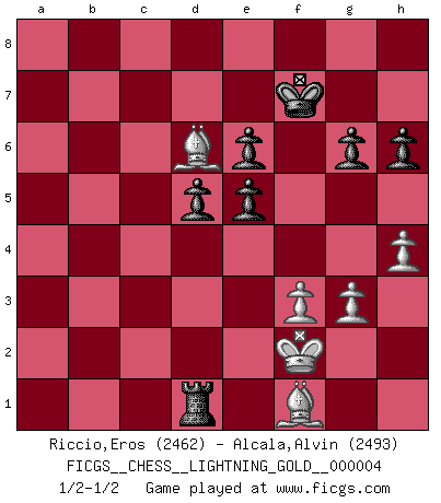Last move : 1/2-1/2 2016 January 28 22:29:55 [Event "FICGS__CHESS__LIGHTNING_GOLD__000004"] [Site "FICGS"] [Date "2016.01.28"] [Round "1"] [White "Riccio,Eros"] [Black "Alcala,Alvin"] [Result "1/2-1/2"] [WhiteElo "2462"] [BlackElo "2493"] 1.e4 c5 2.d4 cxd4 3.c3 dxc3 4.Nxc3 Nc6 5.Nf3 e6 6.Bc4 a6 7.O-O b5 8.Bd3 Bb7 9.Bf4 d6 10.Rc1 Be7 11.Nxb5 e5 12.Be3 axb5 13.Bxb5 Qd7 14.Qc2 Rc8 15.Rfd1 Qc7 16.Qa4 Bf6 17.Bd2 Kf8 18.Bb4 Be7 19.Rxc6 Bxc6 20.Rc1 g6 21.Bxc6 Kg7 22.h3 Qb8 23.Ba3 Bf8 24.b4 Ne7 25.Bb5 Qa8 26.Qb3 Qxe4 27.Bf1 Qf5 28.b5 Qe6 29.Qb2 Rxc1 30.Qxc1 Nc8 31.Qc6 Qxa2 32.Bc1 Be7 33.b6 Nxb6 34.Qxb6 Rc8 35.Bd2 Qd5 36.Qe3 Kg8 37.h4 Bf6 38.Ng5 Rc2 39.Bb4 Rb2 40.Ba3 Bxg5 41.Qxg5 Rd2 42.Kh2 h6 43.Qd8+ Kh7 44.Qf6 Qe6 45.Qxe6 fxe6 46.f3 Kg7 47.Kg1 Kf7 48.g3 Rd1 49.Kf2 d5 50.Bd6 1/2-1/2 Sicilian : Smith-Morra gambit Kingside Castling by player White (move 7) This chess game ended in a draw. Follow this game move after move (download)The mistakes are there, waiting to be made. (Savielly Tartakower) Wer der Ansicht ist, daß alle Schachspieler verrückt sind, wird durch Studium des Lebens von Emil Josef Diemer nicht auf andere Gedanken kommen. (Hans Ree) El Ajedrez tiene tanto misterio como las mujeres. (Purdy) Les échecs, c'est l'art d'analyser. (Mikhail Botvinnik) Chess is as much a mystery as women. (Purdy)