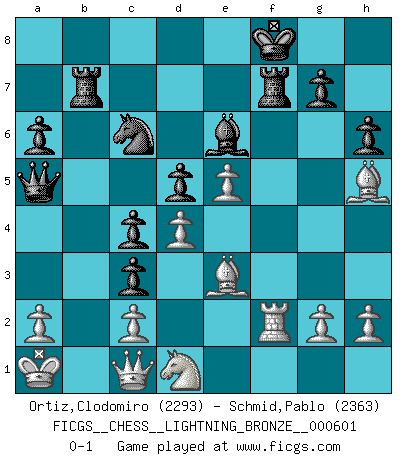 Last move : 0-1 2016 January 28 23:33:12 [Event "FICGS__CHESS__LIGHTNING_BRONZE__000601"] [Site "FICGS"] [Date "2016.01.28"] [Round "1"] [White "Ortiz,Clodomiro"] [Black "Schmid,Pablo"] [Result "0-1"] [WhiteElo "2293"] [BlackElo "2363"] 1.e4 e6 2.Nc3 d5 3.d4 Nf6 4.e5 Nfd7 5.Be3 c5 6.f4 Nc6 7.Nf3 a6 8.Qd2 Qb6 9.O-O-O Qc7 10.Kb1 b5 11.f5 c4 12.fxe6 fxe6 13.Be2 Nb6 14.Rdf1 b4 15.Nd1 Na4 16.Ng5 Rb8 17.Bg4 Qa5 18.Rxf8+ Rxf8 19.Qc1 h6 20.Nxe6 Nc3+ 21.bxc3 bxc3 22.Ka1 Rf7 23.Bh5 Bxe6 24.Rf1 R8b7 25.Rf2 Kf8 0-1 French defense Queenside Castling by player White (move 9) Player Black won this chess game. Follow this game move after move (download)Do you realize Fischer almost never has any bad pieces? He exchanges them, and the bad pieces remain with his opponents. (Yuri Balashov) Die Elozahlen sind sehr schlecht für das Schach. Jetzt ist Schach eine Sportindustrie, die darauf zielt Elopunkte zu machen. (Miguel Najdorf) En la perfecta combinación de Ajedrez como en una historia corta de primera clase, toda la trama y contra trama deberá conducir hacia un final sorprendente, el interes no es mitigado hasta el último momento. (Yates and Winter) On n'a jamais que l'âge auquel on a commence à jouer aux échecs car après on cesse de vieillir. (Capablanca) The Internet is the world's largest library. It's just that all the books are on the floor. (John Allen Paulos)