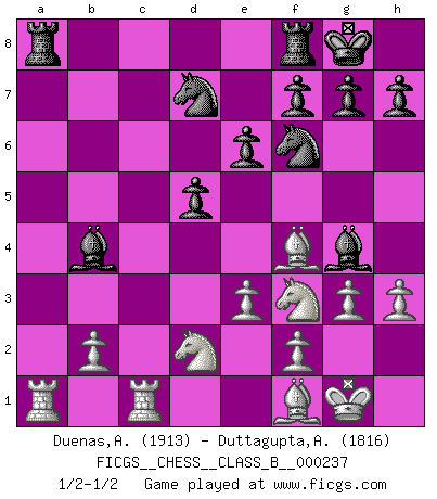 Last move : 1/2-1/2 2016 April 2 21:28:53 [Event "FICGS__CHESS__CLASS_B__000237"] [Site "FICGS"] [Date "2016.01.31"] [Round "1"] [White "Duenas,Alexis"] [Black "Duttagupta,Aniruddha"] [Result "1/2-1/2"] [WhiteElo "1913"] [BlackElo "1816"] 1.d4 d5 2.c4 c6 3.Nf3 Nf6 4.g3 Bg4 5.Bg2 e6 6.O-O Nbd7 7.Qb3 Qb6 8.c5 Qa6 9.Bf4 b6 10.cxb6 axb6 11.Rc1 b5 12.Nbd2 c5 13.dxc5 Bxc5 14.a3 O-O 15.e3 b4 16.Bf1 Qb6 17.axb4 Qxb4 18.Qxb4 Bxb4 19.h3 1/2-1/2 QGD Slav : 3.Nf3 Kingside Castling by player White (move 6) Kingside Castling by player Black (move 14) This chess game ended in a draw. Follow this game move after move (download)The Pawns are the soul of the game. (Francois Andre Danican Philidor) Sicherlich können nur Meister einen Stil haben. Daß ein nicht-Meister auch nur ein einziges Mal in seinem Leben eine Partie folgerecht durchführte, habe ich niemals bemerkt. (Emanuel Lasker) Personalmente, yo prefiero mirar hacia el futuro en donde un programa de computadora gane el título mundial de Ajedrez. La humanidad necesita una lección de humildad. (Richard Dawkings) Mais l'homme est une créature légère et illogique : semblable au joueur d'échecs, il n'aime que le processus du but à atteindre, non le but lui-même. (Dostoïevsky) Two beer, or not two beer. (Unknown)