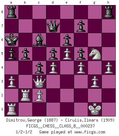 Last move : 1/2-1/2 2016 September 6 9:0:59 [Event "FICGS__CHESS__CLASS_B__000237"] [Site "FICGS"] [Date "2016.01.31"] [Round "1"] [White "Dimitrov,George"] [Black "Cirulis,Ilmars"] [Result "1/2-1/2"] [WhiteElo "1887"] [BlackElo "1909"] 1.e4 a6 2.d4 e6 3.f4 d5 4.Nc3 Bb4 5.e5 c5 6.a3 Bxc3+ 7.bxc3 c4 8.Qg4 g6 9.Be2 Bd7 10.Nf3 h5 11.Qg3 Ba4 12.Bd1 Ne7 13.Nh4 Nbc6 14.Rb1 Qa5 15.O-O O-O-O 16.Qe1 Na7 17.Qd2 Nb5 18.Nf3 Kb8 19.Ng5 Rdf8 20.Qe1 Qc7 21.Rb4 Na7 22.Bd2 Qa5 23.Rb2 Nf5 24.Bf3 Bc6 25.Qc1 Nh4 26.Be2 Nc8 27.Rb4 Nb6 28.Be3 Kc7 29.Bf2 Nf5 30.Nf3 Na4 31.Qd2 b5 32.Nh4 Ne7 33.Kh1 Rc8 34.Nf3 Nf5 35.Ng5 Be8 36.h3 Kb7 37.Bf3 Ne7 38.Be1 Qc7 39.Kh2 a5 40.Rb1 Nf5 41.Bf2 Nb6 42.Kg1 Bc6 43.Ra1 Na4 44.Rfb1 Qe7 45.Be2 Ka7 46.Kh1 Kb7 47.Qe1 h4 48.Kg1 Ka6 49.Bg4 Rh6 50.Bxf5 gxf5 51.Bxh4 Nxc3 52.Qxc3 Rxh4 53.g3 R4h8 54.h4 Ra8 55.Rb2 Qd7 1/2-1/2 St. George (Baker) defense Kingside Castling by player White (move 15) Queenside Castling by player Black (move 15) This chess game ended in a draw. Follow this game move after move (download)There is only one thing Fischer does in Chess without pleasure: to lose ! (Boris Spassky) Der Partner hat auch seine Existenzberechtigung. (Savielly Grigorievitsch Tartakower) El Ajedrez es un mar en el cual un mosquito puede beber y un elefante puede bañarse. (Refrán Hindú) Ne tendez aucun piège pour le plaisir ! Ne jouez rien dans l'espoir que l'adversaire réagisse de façon stupide ! Prenez toujours pour acquis que l'adversaire va trouver le meilleur coup ! Ne jouez jamais de coup dans l'espoir que l'adversaire ne voie pas la menace ! Chacun de vos coups doit améliorer la position d'une façon ou d'une autre. A good aphorism is too hard for the tooth of time, and is not worn away with the centuries, although it serves as food for every speech. (Friedrich Nietzsche)