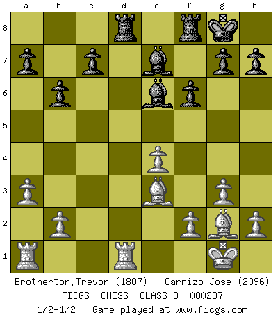 Last move : 1/2-1/2 2016 June 6 1:38:53 [Event "FICGS__CHESS__CLASS_B__000237"] [Site "FICGS"] [Date "2016.01.31"] [Round "1"] [White "Brotherton,Trevor"] [Black "Carrizo,Jose"] [Result "1/2-1/2"] [WhiteElo "1807"] [BlackElo "2096"] 1.g3 d5 2.Bg2 e5 3.d3 Nf6 4.Nf3 Nc6 5.O-O Be7 6.c4 O-O 7.cxd5 Nxd5 8.Nc3 Be6 9.a3 f6 10.Nxd5 Bxd5 11.e4 Be6 12.Be3 Qd7 13.d4 exd4 14.Nxd4 Nxd4 15.Qxd4 Qxd4 16.Bxd4 Rad8 17.Be3 b6 18.Rfd1 1/2-1/2 Benko's Opening Kingside Castling by player White (move 5) Kingside Castling by player Black (move 6) This chess game ended in a draw. Follow this game move after move (download)Fischer is completely natural. He plays no roles. He's like a child. Very, very simple. (Zita Rajcsanyi) Schach ist ein Reich, wo sich die menschliche Phantasie frei entfalten kann. (David Bronstein) No todos los artistas son jugadores de Ajedrez, pero todos los jugadores de Ajedrez son artistas. (Marcel Duchamp) J'ai toujours senti une vague pitié pour l'homme qui ne connaît rien aux échecs, tout comme j'en aurais pour un homme ignorant de l'amour. Les Echecs, comme la musique ou comme l'amour, ont le pouvoir de rendre heureux. (Siegbert Tarrasch) Live, lose, and learn, by observing your opponent how to win. (Amber Steenbock)