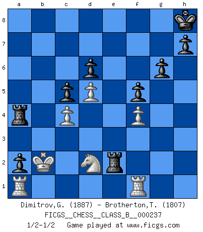 Last move : 1/2-1/2 2017 February 27 18:32:29 [Event "FICGS__CHESS__CLASS_B__000237"] [Site "FICGS"] [Date "2016.01.31"] [Round "1"] [White "Dimitrov,George"] [Black "Brotherton,Trevor"] [Result "1/2-1/2"] [WhiteElo "1887"] [BlackElo "1807"] 1.e4 d6 2.d4 g6 3.Nc3 c6 4.Be3 Bg7 5.Qd2 Nf6 6.f3 Qa5 7.Bd3 Nbd7 8.Nge2 O-O 9.a3 e5 10.O-O-O b5 11.g4 b4 12.Na2 exd4 13.Nxd4 c5 14.Nc6 Qa4 15.Ne7+ Kh8 16.Kb1 Ne5 17.g5 Be6 18.gxf6 Bxf6 19.Nd5 Bxd5 20.exd5 bxa3 21.b3 Rfb8 22.Kc1 Qe8 23.Rhe1 Nxd3+ 24.Qxd3 Qe5 25.Kd2 Qb2 26.Ra1 a5 27.Reb1 Qe5 28.h4 Re8 29.f4 Qe4 30.Qxe4 Rxe4 31.c3 Rae8 32.Re1 Bxh4 33.Re2 f5 34.Nc1 Bg3 35.Kd3 a4 36.c4 axb3 37.Nxb3 Bf2 38.Rxf2 Rxe3+ 39.Kc2 Ra8 40.Nd2 Ra4 41.R2f1 a2 42.Kb2 Re2 43.Kb3 Rb4+ 44.Kc3 Re3+ 45.Kc2 Ra4 46.Kb2 Re2 1/2-1/2 King's pawn Opening Kingside Castling by player Black (move 8) Queenside Castling by player White (move 10) This chess game ended in a draw. Follow this game move after move (download)Life is a kind of Chess, with struggle, competition, good and ill events. (Benjamin Franklin) Woher wissen wir, daß der Neanderthaler Blindschach gespielt hat? -- Bei Ausgrabungen wurden keine Schachbretter und Figuren gefunden. (Anonymous) Nunca nadie ha ganado una partida de Ajedrez rindiendose. (Unknown) Les Echecs, c'est l'art de la guerre sans les charniers, c'est la résurrection des morts tombés au champ d'honneur, l'espoir perpétuel, la suprématie de l'intelligence sur la force, la culture de l'esprit. (F. Szpiner) They say poker is a zero-sum game. It must be, because every time I play my sum ends up zero. (Max Shapiro)