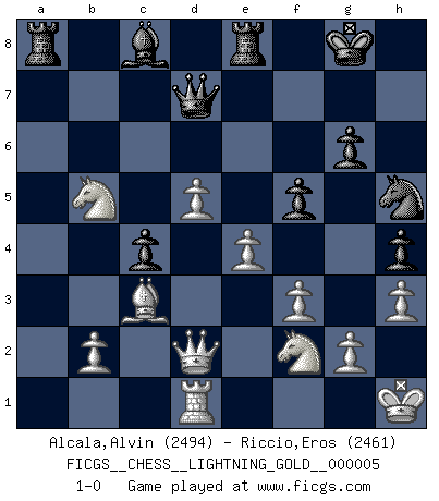 Last move : 1-0 2016 February 1 19:0:54 [Event "FICGS__CHESS__LIGHTNING_GOLD__000005"] [Site "FICGS"] [Date "2016.02.01"] [Round "1"] [White "Alcala,Alvin"] [Black "Riccio,Eros"] [Result "1-0"] [WhiteElo "2494"] [BlackElo "2461"] 1.c4 g6 2.d4 Bg7 3.Nc3 d6 4.e4 Nf6 5.f3 O-O 6.Nge2 c5 7.d5 e6 8.Ng3 exd5 9.cxd5 a6 10.a4 Nbd7 11.Be2 h5 12.Bg5 Qc7 13.O-O c4 14.Be3 h4 15.Nh1 Nc5 16.a5 Nb3 17.Bb6 Qe7 18.Ra4 Nd7 19.Be3 Qd8 20.Bxc4 Nxa5 21.Be2 b5 22.Ra2 Re8 23.Nf2 Rb8 24.Kh1 Nc4 25.Bxc4 bxc4 26.h3 f5 27.Bd4 Ne5 28.Qd2 Qf6 29.Ne2 Qf8 30.Bc3 Bh6 31.Qc2 Be3 32.Nd4 Qf7 33.Ra4 Bf4 34.Nd1 Bd7 35.Rxa6 Ra8 36.Rxd6 Nd3 37.Rb6 Bc7 38.Rb7 Bc8 39.Rxc7 Qxc7 40.Nf2 Nf4 41.Nb5 Qd7 42.Qd2 Nh5 43.Rd1 1-0 English Opening Kingside Castling by player Black (move 5) Kingside Castling by player White (move 13) Player White won this chess game. Follow this game move after move (download)Openings teach you openings. Endgames teach you chess ! (Stephan Gerzadowicz) Der zweitbeste Zug ist oft der einzig richtige. (Savielly Grigorievitsch Tartakower) Una compensación adecuada por un sacrificio es tener una combinación sólida que conduce a una posición ganadora; una compensación adecuada por una metida de pata es dejar a tu oponente arrebatar una derrota de las fauces de la victoria. (Bruce A. Moon) Karpov est une pièce de musée. (Garry Kasparov) Convictions are more dangerous enemies of truth than lies. (Friedrich Nietzsche)