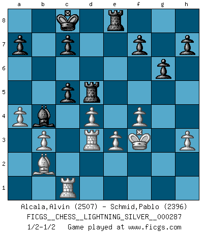 Last move : 1/2-1/2 2016 February 1 19:47:59 [Event "FICGS__CHESS__LIGHTNING_SILVER__000287"] [Site "FICGS"] [Date "2016.02.01"] [Round "1"] [White "Alcala,Alvin"] [Black "Schmid,Pablo"] [Result "1/2-1/2"] [WhiteElo "2507"] [BlackElo "2396"] 1.c4 e5 2.Nc3 Nf6 3.g3 d5 4.cxd5 Nxd5 5.Bg2 Nb6 6.e3 Nc6 7.Nge2 Qd3 8.a4 Bb4 9.f4 Bg4 10.h3 Bxe2 11.Qxe2 Qxe2+ 12.Kxe2 exf4 13.Na2 Bd6 14.gxf4 O-O-O 15.Bxc6 bxc6 16.b3 Rhe8 17.Bb2 Nd5 18.Kf3 g6 19.Rac1 Nb4 20.Nxb4 Bxb4 21.d4 c5 22.Rhd1 Rd5 23.Rd3 1/2-1/2 English : Bremen, reverse Dragon Queenside Castling by player Black (move 14) This chess game ended in a draw. Follow this game move after move (download)The hallmark of the artist is simplicity. (Larry Evans) Ein Gewinn durch eine ungenaue Kombination, sei sie auch noch so vorzeigbar, erfüllt mich mit Schaudern. (Wilhelm Steinitz) Observen a Garry Kasparov. Después de una derrota, invariablemente el gana la próxima partida. Prácticamente hace pedazos a su siguiente oponente. Eso es algo que tenemos que aprender a lograr. (Maurice Ashley) Je menace de comprendre la position. (Anonyme) You have to believe in yourself. (Sun Tzu)