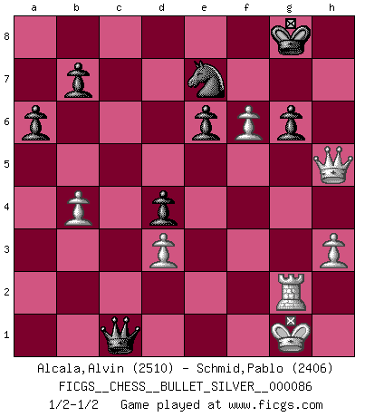 Last move : 1/2-1/2 2016 February 2 19:32:55 [Event "FICGS__CHESS__BULLET_SILVER__000086"] [Site "FICGS"] [Date "2016.02.02"] [Round "1"] [White "Alcala,Alvin"] [Black "Schmid,Pablo"] [Result "1/2-1/2"] [WhiteElo "2510"] [BlackElo "2406"] 1.d4 e6 2.e4 d5 3.Nc3 Nf6 4.e5 Nfd7 5.f4 c5 6.Nf3 Nc6 7.Be3 a6 8.Qd2 Qb6 9.Rb1 Qc7 10.dxc5 Bxc5 11.Bxc5 Nxc5 12.b4 Nd7 13.Bd3 h6 14.O-O O-O 15.Kh1 Nb6 16.a4 d4 17.Ne4 Nxa4 18.g4 Nc3 19.g5 Nxe4 20.Bxe4 h5 21.g6 fxg6 22.Bxg6 Ne7 23.Be4 Nf5 24.Qe2 Bd7 25.Ng5 g6 26.Rg1 Qb6 27.h3 Bb5 28.Bd3 Ne7 29.Ne4 Rf5 30.Rg2 Raf8 31.Kh2 Bxd3 32.cxd3 Rxf4 33.Qxh5 Qc7 34.Rbg1 R8f7 35.Kh1 Rf1 36.Nf6+ R7xf6 37.exf6 Rxg1+ 38.Kxg1 Qc1+ 39.Kh2 Qf4+ 40.Kg1 Qc1+ 41.Kh2 Qf4+ 42.Kg1 Qc1+ 1/2-1/2 Queen's pawn Kingside Castling by player White (move 14) Kingside Castling by player Black (move 14) This chess game ended in a draw. Follow this game move after move (download)Help your pieces so they can help you. (Paul Morphy) Wenn du auf das Glück wartest, wird das Leben ziemlich langweilig. (Mikhail Nekhemyevich Tal) Los finales de Peón son del Ajedrez lo que el cesped es del Golf. (Cecil Purdy) Les écrivains ont utilisé les échecs pour analyser les côtés extrêmes de la nature humaine. Dans ce cadre, les échecs offrent un champ d'expérimentation idéal. Mais on pourrait faire la même chose avec la peinture. Et là, en vous référant à Van Gogh, vous ne tirerez pas de conclusion définitive sur les peintres. (Gary Kasparov) Shallow men believe in luck. Strong men belive in cause and effect. (Ralph Waldo Emerson)