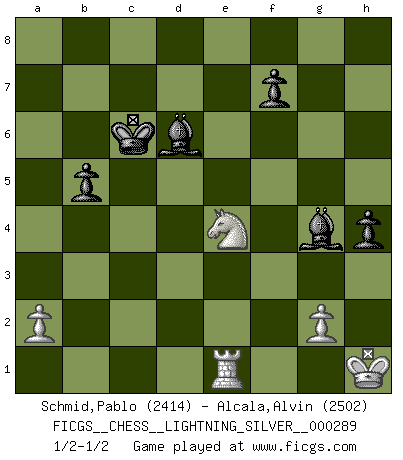Last move : 1/2-1/2 2016 February 2 19:59:49 [Event "FICGS__CHESS__LIGHTNING_SILVER__000289"] [Site "FICGS"] [Date "2016.02.02"] [Round "1"] [White "Schmid,Pablo"] [Black "Alcala,Alvin"] [Result "1/2-1/2"] [WhiteElo "2414"] [BlackElo "2502"] 1.e4 c5 2.Nf3 d6 3.d4 cxd4 4.Nxd4 Nf6 5.Nc3 a6 6.Bg5 e6 7.f4 Qb6 8.Qd2 Qxb2 9.Rb1 Qa3 10.e5 h6 11.Bh4 dxe5 12.fxe5 g5 13.exf6 gxh4 14.Be2 Qa5 15.O-O Nd7 16.Kh1 Qg5 17.Rf4 e5 18.Nd5 exd4 19.Qxd4 Bc5 20.Qe4+ Kd8 21.Rf5 Re8 22.Qxe8+ Kxe8 23.Rxg5 hxg5 24.Nc7+ Kd8 25.Nxa8 Nxf6 26.Bf3 b5 27.Rd1+ Ke7 28.h3 Bd7 29.Nc7 Bd6 30.Re1+ Kd8 31.Na8 g4 32.hxg4 Nxg4 33.Nb6 Be6 34.Nd5 Kc8 35.Bxg4 Bxg4 36.c4 Kb7 37.cxb5 axb5 38.Nc3 Kc6 39.Ne4 1/2-1/2 Sicilian : Najdorf, 7...Qb6 Kingside Castling by player White (move 15) This chess game ended in a draw. Follow this game move after move (download)You are for me the Queen on d8 and I am the Pawn on d7 !! (Eduard Gufeld) Alle Schachspieler sollten auch ein Hobby haben. (Savielly Grigorievitsch Tartakower) El Ajedrez no es una pizca de inferior al violín, y tenemos un gran número de violinistas profesionales. (Mikhail Botvinnik) Les ravages du H expliquent la différence de niveau entre Tal et Thal [Abergel]. I teach you to lie, cheat and steal, and as soon as my back's turned you wait in line ? (Gregory House, House M.D.)