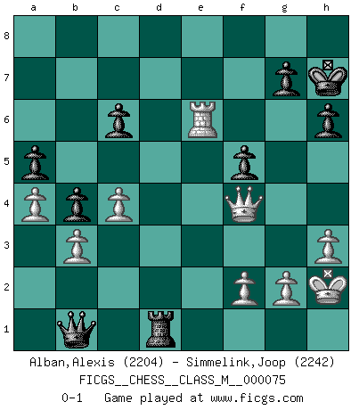 Last move : 0-1 2016 November 21 5:39:13 [Event "FICGS__CHESS__CLASS_M__000075"] [Site "FICGS"] [Date "2016.02.03"] [Round "1"] [White "Alban,Alexis"] [Black "Simmelink,Joop"] [Result "0-1"] [WhiteElo "2204"] [BlackElo "2242"] 1.e4 c6 2.d4 d5 3.Nd2 dxe4 4.Nxe4 Nd7 5.Nf3 Ngf6 6.Nc3 Nb6 7.h3 Bf5 8.Bd3 Bxd3 9.Qxd3 e6 10.O-O Bd6 11.Bg5 Qc7 12.Ne4 Nxe4 13.Qxe4 h6 14.Bd2 Nc4 15.Bc1 b5 16.Re1 O-O 17.Qg4 f5 18.Qh4 e5 19.dxe5 Nxe5 20.Qh5 Nxf3+ 21.Qxf3 Rad8 22.a4 Rf7 23.Be3 a5 24.b3 Kh7 25.Re2 R8d7 26.Bd2 b4 27.c4 Qd8 28.Rae1 Qf6 29.Re6 Qb2 30.Rd1 Qc2 31.Bf4 Bxf4 32.Rxd7 Rxd7 33.Qxf4 Qb1+ 34.Kh2 Rd1 0-1 Caro-Kann : 3.Nd2 Kingside Castling by player White (move 10) Kingside Castling by player Black (move 16) Player Black won this chess game. Follow this game move after move (download)Chess is thirty to forty percent psychology. You don't have this when you play a computer. I can't confuse it. (Judith Polgar) Ich verstehe Aljechins Kombinationen ganz gut; aber woher er diese Angriffschancen bekommt und wie er die Eröffnung behandelt das ist für mich ein Buch mit sieben Siegeln. (Rudolf Spielmann) El jugador blanco perdió porque fallo en recordar la coreccta continuación y tuvo que pensar por sí mismo las movidas. (Siegbert Tarrasch) Toute estimation doit être constamment réévaluée. (Jacob Estrin) If we don't succeed, we run the risk of failure. (George W. Bush)