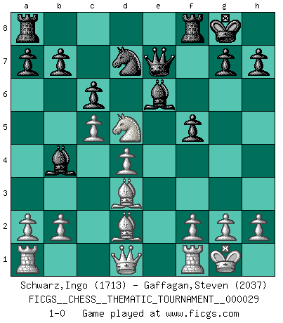Last move : 1-0 2007 August 13 21:28:9 [Event "FICGS__CHESS__THEMATIC_TOURNAMENT__000029"] [Site "FICGS"] [Date "2007.03.20"] [Round "1"] [White "Schwarz,Ingo"] [Black "Gaffagan,Steven"] [Result "1-0"] [WhiteElo "1713"] [BlackElo "2037"] 1.e4 e6 2.d4 f5 3.exf5 exf5 4.Bd3 d5 5.c4 Bb4+ 6.Nc3 Nf6 7.Bd2 Be6 8.c5 O-O 9.Nge2 c6 10.O-O Nbd7 11.Nf4 Qe7 12.Ncxd5 Nxd5 13.Nxd5 1-0 This chess game has been lost on time (started : 2007.03.20 14:50:51) French defense Kingside Castling by player Black (move 8) Kingside Castling by player White (move 10) Player White won this chess game. Follow this game move after move (download)Fischer Chess play was always razor-sharp, rational and brilliant. One of the best ever. (Dave Regis) Es ist im Leben wie im Schachspiel. Wir entwerfen einen Plan, dieser bleibt jedoch bedingt durch das, was im Schachspiel dem Gegner, im Leben dem Schicksal zu tun belieben wird. (Arthur Schopenhauer) Un sacrificio se refuta mucho mejor al aceptarlo. (Wilhelm Steinitz) Le jeu d'échecs fait naître et fortifie en nous plusieurs qualités précieuses dans le cours de l'existence, telles que la prévoyance, la circonspection, la prudence, et la persévérance. (Benjamin Franklin - 1783, la morale des échecs) Kids, you tried your best and you failed miserably. The lesson is, never try. (Simpsons)