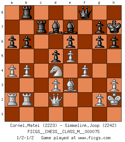 Last move : 1/2-1/2 2016 August 21 12:51:31 [Event "FICGS__CHESS__CLASS_M__000075"] [Site "FICGS"] [Date "2016.02.03"] [Round "1"] [White "Cornel,Matei"] [Black "Simmelink,Joop"] [Result "1/2-1/2"] [WhiteElo "2223"] [BlackElo "2242"] 1.e4 c6 2.d4 d5 3.e5 c5 4.Nf3 cxd4 5.Qxd4 Nc6 6.Qf4 e6 7.Bd3 Nb4 8.O-O Nxd3 9.cxd3 Ne7 10.Nc3 Ng6 11.Qg3 Be7 12.Ne2 O-O 13.Nf4 Bd7 14.Nxg6 fxg6 15.a3 Rc8 16.Be3 Re8 17.Qg4 Qa5 18.a4 a6 19.Bd2 Qb6 20.b4 Rc2 21.Rfb1 Rb8 22.Be3 Qd8 23.Nd4 Rc3 24.Qd1 Qf8 25.Ne2 R3c8 26.Qd2 h6 27.f4 Rc7 28.Rb2 b6 29.h3 Kh7 30.Kh2 Qc8 31.Nd4 Qf8 32.R1a2 1/2-1/2 Caro-Kann : Advance variation Kingside Castling by player White (move 8) Kingside Castling by player Black (move 12) This chess game ended in a draw. Follow this game move after move (download)Chess holds its master in its own bonds, shackling the mind and brain so that the inner freedom of the very strongest must suffer. (Albert Einstein) Rubinstein ist ein Turmendspiel, welches die Götter vor tausenden von Jahren begannen. (Savielly Grigorievitsch Tartakower) No hay un Gran Maestro de Ajedrez que sea normal; solo se diferencían ellos por la magnitud de su locura. (Viktor Korchnoi) Le jeu d'échecs est comme rejeté hors du temps. (Antoine de Saint-Exupéry) Happy endings are just stories that haven't finished yet. (Jane Smith in Mr & Mrs Smith)