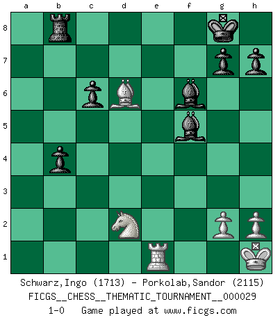 Last move : 1-0 2007 November 25 7:37:34 [Event "FICGS__CHESS__THEMATIC_TOURNAMENT__000029"] [Site "FICGS"] [Date "2007.03.20"] [Round "1"] [White "Schwarz,Ingo"] [Black "Porkolab,Sandor"] [Result "1-0"] [WhiteElo "1713"] [BlackElo "2115"] 1.e4 e6 2.d4 f5 3.exf5 exf5 4.Bd3 d5 5.Nf3 Nf6 6.O-O Be7 7.c4 O-O 8.Qc2 Nc6 9.Nc3 Nb4 10.Qe2 Nxd3 11.Qxd3 Be6 12.c5 Ne4 13.Bf4 c6 14.Nd2 b6 15.b4 a5 16.a3 Bc8 17.f3 bxc5 18.fxe4 axb4 19.axb4 fxe4 20.Ncxe4 Rxa1 21.Rxa1 dxe4 22.Qxe4 Bf5 23.Qe3 Qxd4 24.Re1 Bf6 25.Kh1 Qxe3 26.Bxe3 cxb4 27.Bc5 Rb8 28.Bd6 1-0 This chess game has been lost on time (started : 2007.03.20 14:50:51) French defense Kingside Castling by player White (move 6) Kingside Castling by player Black (move 7) Player White won this chess game. Follow this game move after move (download)The most powerful weapon in Chess is to have the next move. (David Bronstein) Ich organisiere ein großes Turnier, was mich etwa 120000 Dollar kostet. Ich denke, das ist das erste Mal in der Schachgeschichte, daß ein Schachgroßmeister auch als Mäzen auftritt. (Miguel Najdorf) El Ajedrez te enseña a controlarl la excitación inicial que sientes cuando vez algo que parece bueno y te enseña a pensar objetivamente cuando te encuentras en problemas. (Stanley Kubrick) Echiquier : carré parfait, comme la Jérusalem nouvelle décrite par l'auteur de l'Apocalypse, huit cases sur huit, exaltation du chiffre 4, symbole du cosmos aux quatre horizons... où le noir et le blanc, l'ombre et la lumière, le mal et le bien s'entremêlent et se conjuguent. (Robert Couffignal, Le Gambit du poète) Pushing plastic is for the many, pushing virtual pieces is for the fewer, pushing wood is for the very few. (Normajean Yates)