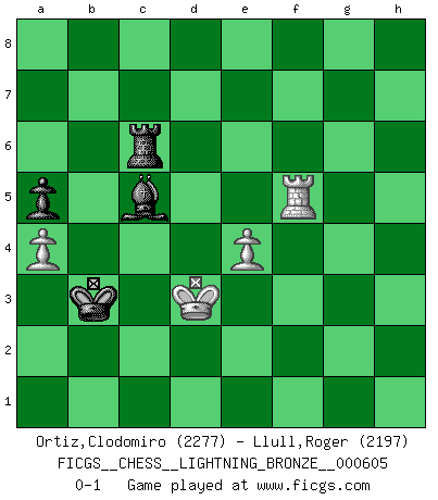 Last move : 0-1 2016 February 4 22:42:28 [Event "FICGS__CHESS__LIGHTNING_BRONZE__000605"] [Site "FICGS"] [Date "2016.02.04"] [Round "1"] [White "Ortiz,Clodomiro"] [Black "Llull,Roger"] [Result "0-1"] [WhiteElo "2277"] [BlackElo "2197"] 1.d4 d5 2.c4 e6 3.Nf3 dxc4 4.e3 Nf6 5.Bxc4 a6 6.O-O c5 7.dxc5 Bxc5 8.Qxd8+ Kxd8 9.Ne5 Ke7 10.Be2 Rd8 11.Nd2 Bd7 12.Nd3 Bd6 13.b3 Bb5 14.Nc4 Bxc4 15.bxc4 Nbd7 16.Rb1 b6 17.Bb2 Rac8 18.Rfc1 Ne4 19.Bxg7 f6 20.a4 Ndc5 21.Nxc5 Bxc5 22.Rc2 e5 23.Bg4 Kf7 24.Bf5 Nd6 25.Bxc8 Rxc8 26.Bxf6 Kxf6 27.Kf1 Ke6 28.Ke2 a5 29.Rd1 h5 30.g3 Rg8 31.Kf3 h4 32.Rd5 Bb4 33.Kg2 Rh8 34.Rc1 h3+ 35.Kf1 Ne4 36.f4 Bd6 37.R5d1 Rc8 38.Rc2 Nf6 39.fxe5 Bxe5 40.Rb1 Ng4 41.Rxb6+ Kf5 42.Ke2 Nxh2 43.Rh6 Kg4 44.Rc1 Nf3 45.Rxh3 Rd8 46.Rh4+ Nxh4 47.gxh4 Kxh4 48.Rg1 Bc3 49.Rc1 Bb4 50.Rg1 Rd6 51.Rg7 Kh5 52.Kf3 Rc6 53.Rg4 Bc3 54.Rf4 Kg6 55.Ke2 Be5 56.Rh4 Kg5 57.Re4 Kf5 58.Rh4 Bf6 59.Rf4+ Ke6 60.Re4+ Kd6 61.Rf4 Kc5 62.Kd3 Kb4 63.c5 Kb3 64.Rf5 Be7 65.e4 Bxc5 0-1 Queen's gambit declined Kingside Castling by player White (move 6) 10 pieces endgame at move 47 : White KRPPPP , Black KRBP WHITE : King + 1 Rook 4 Pawns BLACK : King + 1 Rook 1 Bishop 1 Pawn 9 pieces endgame at move 47 : White KRPPP , Black KRBP WHITE : King + 1 Rook 3 Pawns BLACK : King + 1 Rook 1 Bishop 1 Pawn 8 pieces endgame at move 65 : White KRPP , Black KRBP WHITE : King + 1 Rook 2 Pawns BLACK : King + 1 Rook 1 Bishop 1 Pawn Player Black won this chess game. Follow this game move after move (download)Every Pawn is a potential Queen. (James Mason) Zu meiner Zeit war ein 20 jähriger ein junger Spieler, heute ist er ein Veteran. (Garry Kasparov) El Ajedrez es tortura mental. (Garry Kasparov) Je fais ceci parce que dans cinquante coups j'obtiendrai cela; je m'appelle Mikhail Moisevitch Botvinnik. (Botvinnik) I live to kill Traxler counterattack. (Ilmars Cirulis)