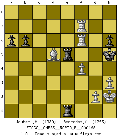 Last move : 1-0 2016 February 23 4:0:35 [Event "FICGS__CHESS__RAPID_E__000168"] [Site "FICGS"] [Date "2016.02.05"] [Round "1"] [White "Joubert,Hennie"] [Black "Barradas,Anderson"] [Result "1-0"] [WhiteElo "1330"] [BlackElo "1295"] 1.e4 e5 2.Nf3 Nf6 3.Nxe5 d6 4.Nf3 Nxe4 5.d4 Bg4 6.d5 Qe7 7.Be3 Nc5 8.Be2 c6 9.O-O Ne4 10.h3 Bxf3 11.Bxf3 Qe5 12.dxc6 Nxc6 13.Re1 Qxb2 14.Nd2 Nxd2 15.Qxd2 Be7 16.Bf4 Qf6 17.Bg3 O-O 18.Rab1 Rab8 19.Red1 b6 20.Bxc6 Rbc8 21.Bf3 Rfd8 22.Qf4 Rxc2 23.Qxf6 gxf6 24.Be4 Rxa2 25.Rb5 Kg7 26.Rh5 h6 27.Bf4 Rh8 28.Bxd6 Bxd6 29.Rxd6 Ra1+ 30.Kh2 Re1 31.f3 Re8 32.Rf5 Re6 33.Rd7 a6 34.Bd5 R6e5 35.Rxf7+ Kg6 36.R5xf6+ Kh5 37.f4 1-0 Petrov : Classical attack Kingside Castling by player White (move 9) Kingside Castling by player Black (move 17) Player White won this chess game. Follow this game move after move (download)I thought the most common mistake [in chess] was the first one: Learning the game :P (Garvin Gray, FICGS forum) Nach Morphy wurde nichts neues mehr in der Behandlung offener Positionen gefunden. (Mikhail Moiseyevich Botvinik) La vida es como el Ajedrez, con lucha, competición y eventos buenos y malos. (Benjamin Franklin) A chaque perte on perd un peu de soi. (Joël Lautier) Treat your password like your toothbrush. Don't let anybody else use it, and get a new one every six months. (Clifford Stoll)