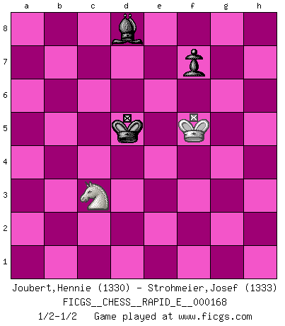 Last move : 1/2-1/2 2016 July 14 21:6:33 [Event "FICGS__CHESS__RAPID_E__000168"] [Site "FICGS"] [Date "2016.02.05"] [Round "1"] [White "Joubert,Hennie"] [Black "Strohmeier,Josef"] [Result "1/2-1/2"] [WhiteElo "1330"] [BlackElo "1333"] 1.e4 c5 2.Nf3 Nc6 3.d4 cxd4 4.Nxd4 Nf6 5.Nc3 e6 6.Bg5 Be7 7.Be2 O-O 8.O-O a6 9.Kh1 h6 10.Bh4 Ne5 11.f4 Ng6 12.Bxf6 Bxf6 13.e5 Be7 14.g3 b5 15.a3 Bb7+ 16.Kg1 Bc5 17.Bf3 Bxf3 18.Rxf3 Qb6 19.Nce2 Ne7 20.Kf1 Rad8 21.Rd3 d6 22.Nf3 Nd5 23.Qd2 dxe5 24.Nxe5 Be3 25.Qe1 Bc5 26.Nf3 Ne3+ 27.Rxe3 Bxe3 28.Nc3 Bc5 29.Ne4 Be7 30.Qf2 Qxf2+ 31.Kxf2 Rc8 32.c3 Rfd8 33.Ke2 Rd5 34.h4 Rcd8 35.Rb1 Rd3 36.Nd4 R3xd4 37.cxd4 Rxd4 38.Ke3 Rd5 39.Rc1 a5 40.Rc7 Kf8 41.Rc8+ Bd8 42.Nc3 Rd7 43.Nxb5 Ke7 44.Ra8 Bb6+ 45.Ke2 Kf6 46.Rb8 Bc5 47.Rc8 Be7 48.Rc7 Rxc7 49.Nxc7 Bd8 50.Nb5 g5 51.hxg5+ hxg5 52.Kf3 gxf4 53.gxf4 e5 54.fxe5+ Kxe5 55.b4 axb4 56.axb4 Kd5 57.Nc3+ Kc4 58.Ne4 Kxb4 59.Kf4 Kc4 60.Kf5 Kd5 61.Nc3+ Kd4 62.Ne4 Kd5 63.Nc3+ 1/2-1/2 Sicilian defense Kingside Castling by player Black (move 7) Kingside Castling by player White (move 8) 10 pieces endgame at move 53 : White KNPPP , Black KBPPP WHITE : King + 1 Knight 3 Pawns BLACK : King + 1 Bishop 3 Pawns 9 pieces endgame at move 54 : White KNPPP , Black KBPP WHITE : King + 1 Knight 3 Pawns BLACK : King + 1 Bishop 2 Pawns 8 pieces endgame at move 54 : White KNPP , Black KBPP WHITE : King + 1 Knight 2 Pawns BLACK : King + 1 Bishop 2 Pawns 7 pieces endgame at move 55 : White KNP , Black KBPP WHITE : King + 1 Knight 1 Pawn BLACK : King + 1 Bishop 2 Pawns 6 pieces endgame at move 56 : White KNP , Black KBP WHITE : King + 1 Knight 1 Pawn BLACK : King + 1 Bishop 1 Pawn 5 pieces endgame at move 58 : White KN , Black KBP WHITE : King + 1 Knight BLACK : King + 1 Bishop 1 Pawn This chess game ended in a draw. Follow this game move after move (download)Only sissies Castle. (Rob Sillars) Ich könnte leicht behaupten: Ja,ja, Leonid Breschnew wollte nicht, daß ich Weltmeister werde. In der Tat war die Sache komplizierter. (Viktor Kortschnoi) La pasion por jugar al Ajedrez es una de las mas inexplicables en el mundo. (H.G. Wells) Des combinaisons [dans le jeu d'échecs] pareilles à des mélodies. Je crois entendre pour ainsi dire la musique des coups... (Vladimir Nabokov) There is no vagueness without wind. (Chinese proverb)