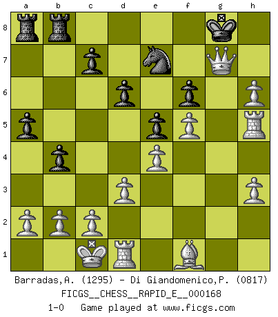 Last move : 1-0 2016 February 27 23:14:6 [Event "FICGS__CHESS__RAPID_E__000168"] [Site "FICGS"] [Date "2016.02.05"] [Round "1"] [White "Barradas,Anderson"] [Black "Di Giandomenico,Pierino"] [Result "1-0"] [WhiteElo "1295"] [BlackElo "0817"] 1.e4 e5 2.Nf3 d6 3.h3 Nf6 4.d3 Be7 5.Nc3 O-O 6.Be3 Be6 7.Qd2 Qd7 8.O-O-O b6 9.g4 a5 10.Ng5 h6 11.Nxe6 Qxe6 12.f4 Nc6 13.f5 Qd7 14.Rg1 Rfb8 15.g5 Nh5 16.Nd5 b5 17.Nxe7+ Qxe7 18.gxh6 Qf6 19.Bg5 Qxg5 20.Rxg5 f6 21.Rxh5 Ne7 22.Qg2 b4 23.Qxg7+ 1-0 Philidor's defense Kingside Castling by player Black (move 5) Queenside Castling by player White (move 8) Player White won this chess game. Follow this game move after move (download)Chess holds its master in its own bonds, shackling the mind and brain so that the inner freedom of the very strongest must suffer. (Albert Einstein) Kleine Schachspieler machen Mist, und große Schachspieler machen Mist, aber große machen weniger Mist. (Fritz Sämisch) El Ajedrez es 99 por ciento táctica. (Teichmann) Tout change constamment, y compris dans le monde des Echecs. (Botvinnik) Secret operations are essential in war; upon them the army relies to make its every move. (Sun Tzu)