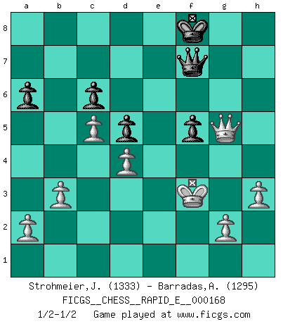 Last move : 1/2-1/2 2016 June 12 1:4:38 [Event "FICGS__CHESS__RAPID_E__000168"] [Site "FICGS"] [Date "2016.02.05"] [Round "1"] [White "Strohmeier,Josef"] [Black "Barradas,Anderson"] [Result "1/2-1/2"] [WhiteElo "1333"] [BlackElo "1295"] 1.e4 c6 2.Nf3 d5 3.exd5 cxd5 4.d4 Bg4 5.Bb5+ Nc6 6.h3 Bh5 7.O-O a6 8.Bxc6+ bxc6 9.Qd3 Nf6 10.Nc3 e6 11.Ne5 Qc7 12.Bf4 Bd6 13.Rfe1 Bxe5 14.Bxe5 Qd7 15.Ne2 Bxe2 16.Rxe2 O-O 17.Bxf6 gxf6 18.Re3 Kh8 19.Rf3 f5 20.Qe3 Rg8 21.Qe5+ Rg7 22.Rg3 Rag8 23.Re1 Qe7 24.R1e3 h5 25.Rxg7 Rxg7 26.Rg3 f6 27.Rxg7 Kxg7 28.Qg3+ Kh6 29.Qf4+ Kh7 30.Qf3 Qf7 31.Qa3 Qb7 32.b3 e5 33.Qa4 e4 34.c4 f4 35.c5 e3 36.Kf1 f5 37.Ke2 Kg6 38.fxe3 fxe3 39.Kxe3 Qe7+ 40.Kf2 Qb7 41.Qa5 h4 42.Qd8 Qf7 43.Qxh4 Kg7 44.Qg5+ Kh7 45.Qh4+ Kg8 46.Kf3 Kf8 47.Qd8+ Kg7 48.Qg5+ Kf8 49.Qd8+ Kg7 50.Qg5+ Kf8 51.Kf4 Qc7+ 52.Kf3 Qf7 1/2-1/2 Caro-Kann defense Kingside Castling by player White (move 7) Kingside Castling by player Black (move 16) This chess game ended in a draw. Follow this game move after move (download)We must make sure that Chess will not be like a dead language, very interesting, but for a very small group. (Sytze Faber) Sie bekommen vielleicht den Eindruck, dass die Spitzenspieler überhaupt gar nicht so stark sind. Aber das stimmt nicht. Es ist eine Illusion. Mit einem Computer an der Seite ist es sehr leicht, Urteile zu fällen, aber wenn man alleine am Brett sitzt, sieht die Sache ganz anders aus. (Vladimir Kramnik) Solo existe una cosa que Fischer hace en el Ajedrez sin placer: ¡perder!. (Boris Spassky) La conception d'un plan est le processus par lequel un joueur exploite les avantages de sa position tout en s'efforçant d'en réduire au minimum les inconvénients. Afin de garantir le succès, un plan doit toujours se fonder sur un diagnostic objectif des particularités d'une position. La conception d'un plan est d'autant plus difficile que la position est équilibrée, et grandement facilitée lorsqu'il n'existe qu'un seul plan susceptible de répondre aux exigences de la position. (Harry Golombek) The question of whether computers can think is just like question of whether submarines can swim. (Edsger W. Dijkstra)