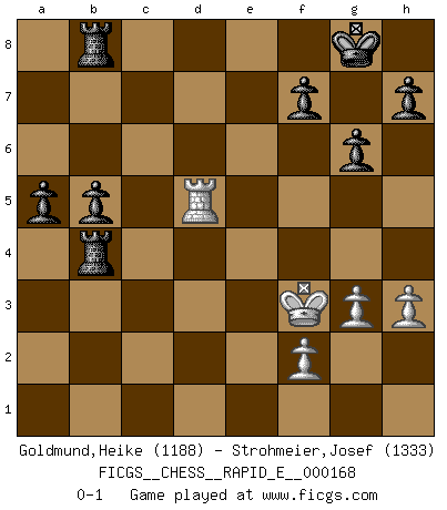 Last move : 0-1 2016 April 18 14:3:54 [Event "FICGS__CHESS__RAPID_E__000168"] [Site "FICGS"] [Date "2016.02.05"] [Round "1"] [White "Goldmund,Heike"] [Black "Strohmeier,Josef"] [Result "0-1"] [WhiteElo "1188"] [BlackElo "1333"] 1.e4 c5 2.b4 cxb4 3.a3 bxa3 4.Bxa3 d6 5.d4 Nf6 6.Nd2 Qc7 7.Ngf3 g6 8.Bd3 Bg7 9.O-O O-O 10.c4 b6 11.Re1 Nc6 12.Rb1 Na5 13.Qc2 Ba6 14.e5 Ne8 15.Bb4 Nc6 16.Ba3 dxe5 17.d5 Na5 18.Bb2 Rc8 19.Nxe5 Nd6 20.Ne4 Nxe4 21.Rxe4 Bb7 22.Rc1 Qd6 23.Qe2 Nb3 24.Rc3 Nc5 25.Bb1 Nxe4 26.Qxe4 Bxe5 27.Rc2 Bxb2 28.Rxb2 e6 29.Ba2 exd5 30.cxd5 Rfe8 31.Qb1 Bxd5 32.h3 Bxa2 33.Rxa2 a5 34.Rb2 Rb8 35.g3 Qc5 36.Rb5 Qd4 37.Kg2 Qe4+ 38.Kh2 Qd4 39.Kg2 Qe4+ 40.Qxe4 Rxe4 41.Kf3 Rb4 42.Rd5 b5 0-1 Sicilian : wing gambit, Carlsbad variation Kingside Castling by player White (move 9) Kingside Castling by player Black (move 9) Player Black won this chess game. Follow this game move after move (download)One bad move nullifies forty good ones. (Horowitz) Kein Schachspieler kann gut schlafen. (H. G. Wells) Cuando tengo las piezas blancas, yo gano porque soy blanco; Cuando tengo las piezas negras, yo gano porque soy Bogolyubov. (Bogolyubov) Toutes les manuvres exécutées sur une colonne ouverte ont pour but ultime l'intrusion définitive sur la septième ou la huitième rangée, en plein cur de la position ennemie. (Aaron Nimzovitch) Life is like internet, nothing interesting, but noone want to leave it. (Ilmars Cirulis)