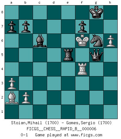 Last move : 0-1 2006 July 12 19:38:43 [Event "FICGS__CHESS__RAPID_B__000006"] [Site "FICGS"] [Date "2006.05.31"] [Round "1"] [White "Stoian,Mihail"] [Black "Gomes,Sergio"] [Result "0-1"] [WhiteElo "1700"] [BlackElo "1700"] 1.Nf3 Nf6 2.c4 e6 3.Nc3 d5 4.d4 Be7 5.e3 O-O 6.Bd3 dxc4 7.Bxc4 c5 8.O-O Bd7 9.Qe2 Nc6 10.a3 cxd4 11.exd4 Rc8 12.Bg5 h6 13.Bh4 Re8 14.Rfd1 Na5 15.Ba2 Nd5 16.Bxe7 Nxe7 17.Rac1 Qc7 18.h3 Nac6 19.Qd3 Ng6 20.d5 Nce5 21.Qe4 exd5 22.Qxd5 Bc6 23.Qb3 Bxf3 24.Ne2 Bc6 25.Nd4 Nf4 26.Qg3 g5 27.h4 Rcd8 28.hxg5 Rxd4 29.gxh6 Neg6 30.Qg5 Qd6 31.Rxd4 Qxd4 32.Rc4 Re1+ 33.Kh2 Qxf2 34.Rxf4 Qg1+ 35.Kh3 Qh1+ 36.Kg4 Qxg2+ 37.Kf5 Re5+ 38.Kf6 Qxg5+ 0-1 Reti Opening Kingside Castling by player Black (move 5) Kingside Castling by player White (move 8) Player Black won this chess game. Follow this game move after move (download)An attack on the wing should be met by play in the center. (Nimzovitch) Frage: Wie viele Autos haben Sie schon zerstört? - Antwort: Nur zwei. (Loek van Wely) El Rey es una pieza de pelea. ¡Usenlo!. (Wilhelm Steinitz) Un journaliste : 'Vous préférez avoir une dame de plus sur l'échiquier ou au lit ?' Boris Spassky : 'Ca dépend de la position.' Somehow our devils are never quite what we expect when we meet them face to face. (Nelson DeMille)