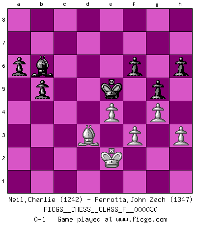 Last move : 0-1 2007 August 14 11:46:51 [Event "FICGS__CHESS__CLASS_F__000030"] [Site "FICGS"] [Date "2007.03.20"] [Round "1"] [White "Neil,Charlie"] [Black "Perrotta,John Zach"] [Result "0-1"] [WhiteElo "1242"] [BlackElo "1347"] 1.d4 d5 2.c4 c6 3.Nf3 Nf6 4.e3 Bg4 5.Nc3 e6 6.Qb3 Qc7 7.Be2 Nbd7 8.O-O dxc4 9.Qxc4 Bd6 10.h3 Bh5 11.Bd2 Nb6 12.Qb3 O-O 13.Rac1 Qd7 14.Rfd1 Qe7 15.a4 e5 16.a5 Nbd5 17.dxe5 Bxe5 18.Nxd5 Nxd5 19.e4 Nf6 20.Bg5 Bxf3 21.Bxf3 Rad8 22.Qc2 Rxd1+ 23.Rxd1 Rd8 24.Bg4 Rxd1+ 25.Qxd1 Qc7 26.b4 h6 27.Bxf6 Bxf6 28.Qd7 Qxd7 29.Bxd7 Bc3 30.b5 cxb5 31.Bxb5 Bxa5 32.f3 Kf8 33.Kf2 Ke7 34.Ke3 Kd6 35.Kd3 f6 36.Kd4 a6 37.Bd3 b5 38.g4 g5 39.Ke3 Bb6+ 40.Ke2 Ke5 0-1 QGD Slav : 4.e3 Kingside Castling by player White (move 8) Kingside Castling by player Black (move 12) Player Black won this chess game. Follow this game move after move (download)With or without the title, Bobby Fischer was unquestionably the greatest player of his time. (Burt Hochberg) Im Schach gewinnt jeder. Hat man Freunde am Spiel - und das ist die Hauptsache - ist auch der Verlust einer Partie kein Unglück. (David Bronstein) En manos de Fischer's, una diminuta ventaja teórica es tan buena como tener una Reina de ventaja. (Isaac Kashdan) Pour se monter efficace, un Cavalier a besoin d'avant-postes ! Les Cavaliers font les meilleurs bloqueurs de pions passés. Man with more than one clock never knows what time it is. (Chinese thought)