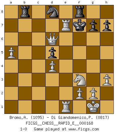 Last move : 1-0 2016 June 23 11:26:57 [Event "FICGS__CHESS__RAPID_E__000168"] [Site "FICGS"] [Date "2016.02.05"] [Round "1"] [White "Bromo,Alexis"] [Black "Di Giandomenico,Pierino"] [Result "1-0"] [WhiteElo "1095"] [BlackElo "0817"] 1.d4 d5 2.c4 dxc4 3.Nc3 Nf6 4.h3 Nc6 5.e3 e5 6.Nf3 Be6 7.a3 exd4 8.exd4 Be7 9.Be2 O-O 10.O-O Nd5 11.Bxc4 Nb6 12.Bxe6 fxe6 13.Re1 Nd5 14.Nxd5 exd5 15.Bf4 Bf6 16.Rc1 Rc8 17.b4 Qd6 18.Bxd6 cxd6 19.Re6 Rcd8 20.b5 Na5 21.a4 a6 22.bxa6 bxa6 23.Qd3 Nb7 24.Qxa6 Rb8 25.a5 Kf7 26.Rce1 Nd8 27.Qxd6 Be7 28.Rxe7+ 1-0 This chess game has been lost on time (started : 2016.02.05 15:55:17) Queen's gambit accepted Kingside Castling by player Black (move 9) Kingside Castling by player White (move 10) Player White won this chess game. Follow this game move after move (download)A thorough understanding of the typical mating continuations makes the most complicated sacrificial combinations leading up to them not only not difficult, but almost a matter of course. (Siegbert Tarrasch) Ich hatte Zahnschmerzen im ersten Spiel. In der zweiten Partie tat mir der Kopf weh. In der dritten war es eine Rheuma-Attacke und während der vierten fühlte ich mich nicht gut. Und in der fünften? Nun, man muss doch nicht jedes Spiel gewinnen, oder? (Savielly Grigorievitsch Tartakower) Las combinaciones han sido siempre el aspecto más intrigante del Ajedrez. Los Maestros las buscan, el público las aplauden, los críticos las alaban. La razón se debe a que las combinaciones hacen posible que el Ajedrez sea más que un ejercicio matemático con una carencia de vida. Ellas son la poesía del juego, son del Ajedrez lo que la melodía es de la música. Ellas representan el triunfo de la mente sobre la materia. (Reuben Fine) Donnez-moi un Cavalier en 6e et je gagnerais toutes mes parties. (Steinitz) Hold em is to stud what chess is to checkers. (Johnny Moss)