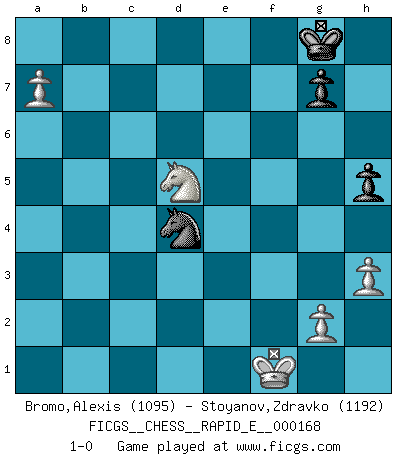 Last move : 1-0 2016 April 4 20:2:45 [Event "FICGS__CHESS__RAPID_E__000168"] [Site "FICGS"] [Date "2016.02.05"] [Round "1"] [White "Bromo,Alexis"] [Black "Stoyanov,Zdravko"] [Result "1-0"] [WhiteElo "1095"] [BlackElo "1192"] 1.d4 d5 2.c4 dxc4 3.Nc3 h6 4.e3 e6 5.a3 Nf6 6.h3 Bd6 7.Bxc4 O-O 8.Nf3 a6 9.O-O b5 10.Bb3 c6 11.a4 Qa5 12.Bd2 b4 13.Na2 Nbd7 14.Qe1 Rb8 15.Rc1 Rb6 16.e4 c5 17.e5 Bxe5 18.dxe5 Nd5 19.Bxd5 exd5 20.b3 Re6 21.Bf4 Bb7 22.Rc2 Qb6 23.Nc1 Nb8 24.Nd3 Rg6 25.Nxc5 d4 26.Nxb7 Qxb7 27.Qd1 Rd8 28.Qd3 Nd7 29.Bg3 a5 30.Qxd4 Qb6 31.Qxb6 Nxb6 32.Re1 Re8 33.Nh4 Rge6 34.f4 Nd7 35.Rc7 Nb6 36.Ra7 Ra8 37.Rxa8+ Nxa8 38.f5 Re7 39.e6 fxe6 40.fxe6 Re8 41.Nf5 Nb6 42.Bc7 Nd5 43.Bxa5 h5 44.Ne3 Rxe6 45.Kf2 Nf4 46.Kf1 Nd3 47.Re2 Nc1 48.Re1 Nxb3 49.Bxb4 Re4 50.Nd5 Rd4 51.Re5 Nc1 52.a5 Nd3 53.Bc3 Nxe5 54.Bxd4 Nc6 55.a6 Nxd4 56.a7 1-0 Queen's gambit accepted Kingside Castling by player Black (move 7) Kingside Castling by player White (move 9) 10 pieces endgame at move 54 : White KBNPPP , Black KNPP WHITE : King + 1 Bishop 1 Knight 3 Pawns BLACK : King + 1 Knight 2 Pawns 9 pieces endgame at move 55 : White KNPPP , Black KNPP WHITE : King + 1 Knight 3 Pawns BLACK : King + 1 Knight 2 Pawns Player White won this chess game. Follow this game move after move (download)Chess is a fighting game which is purely intellectual and includes chance. (Richard Reti) Das Spiel gibt uns die Genugtuung, die das Leben uns versagt. (Emanuel Lasker) Muchos jugadores de Ajedrez se sorprendían cuando después de la partida, Fischer explicaba con calma: 'Yo ya había analizado esta posibilidad' en una posición en la cual yo creía que no era posible de prever desde la apertura. (Mikhail Tal) Psychologiquement, tu dois avoir confiance en toi même, mais cette confiance doit être basée sur des faits. (Robert Fischer) What doesn't kill us makes us stronger. (Friedrich Nietzsche)