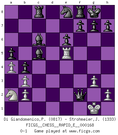 Last move : 0-1 2016 March 23 16:15:40 [Event "FICGS__CHESS__RAPID_E__000168"] [Site "FICGS"] [Date "2016.02.05"] [Round "1"] [White "Di Giandomenico,Pierino"] [Black "Strohmeier,Josef"] [Result "0-1"] [WhiteElo "0817"] [BlackElo "1333"] 1.d4 d5 2.e3 Nf6 3.Bd3 e6 4.Bb5+ c6 5.Ba4 Be7 6.Nf3 O-O 7.O-O Nbd7 8.Nc3 a6 9.Bd2 b5 10.Bb3 c5 11.Rc1 Bb7 12.Re1 c4 13.Qe2 cxb3 14.cxb3 Rc8 15.Ne5 Ne8 16.a4 b4 17.Na2 a5 18.e4 dxe4 19.Qxe4 Bxe4 20.Nc6 Bxc6 21.Rc5 Nxc5 22.dxc5 Bxc5 23.Re5 Qxd2 24.g3 Qxf2+ 0-1 Queen's pawn : Stonewall attack Kingside Castling by player Black (move 6) Kingside Castling by player White (move 7) Player Black won this chess game. Follow this game move after move (download)Any material change in a position must come about by mate, a capture, or a Pawn promotion. (Purdy) Die jungen Leute sollen verstehen, dass sie noch etwas von mir lernen können und müssen. (Viktor Kortschnoi) Una partida de Ajedrez se divide en 3 etapas: la primera cuando piensas que tienes la ventaja, la segunda cuando crees que tienes la ventaja y la tercera... ¡cuando te das cuenta que vas a perder!. (Savielly Tartakower) Dans le domaine de la peinture, de la gravure et de la sculpture, dès la première décennie de notre siècle, les artistes abandonnent la représentation de la partie d'échecs pour se concentrer sur les pièces, sur les échiquiers et sur toutes les variations auxquelles les unes et les autres peuvent donner lieu. On passe en quelque sorte d'un thème social à un thème musical (au sens de la musica médiévale, c'est-à-dire d'une notion qui inclue le rythme, l'harmonie, la construction et la déconstruction, etc.). Graphiquement et picturalement, l'échiquier apparaît comme une structure ouverte, dynamique, d'une richesse infinie, autorisant toutes les combinatoires et débouchant sur des mouvements et des rythmes de nature exponentielle. (Michel Pastoureau) A proverb is a short sentence based on long experience. (Miguel de Cervantes)