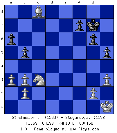 Last move : 1-0 2016 April 18 12:38:27 [Event "FICGS__CHESS__RAPID_E__000168"] [Site "FICGS"] [Date "2016.02.05"] [Round "1"] [White "Strohmeier,Josef"] [Black "Stoyanov,Zdravko"] [Result "1-0"] [WhiteElo "1333"] [BlackElo "1192"] 1.e4 c5 2.Nf3 a6 3.d4 cxd4 4.Nxd4 e5 5.Nb3 Nc6 6.a3 d6 7.Be2 h6 8.O-O Nf6 9.f3 Be7 10.Nc3 O-O 11.Be3 Be6 12.f4 Bxb3 13.cxb3 Nd7 14.Qd2 b5 15.Rad1 Nf6 16.Bf3 Na5 17.Qc2 Rc8 18.fxe5 Ne8 19.exd6 Bxd6 20.e5 Qe7 21.exd6 Qxe3+ 22.Kh1 Nc6 23.Rfe1 Qf4 24.Qd2 Qxd2 25.Rxd2 Nf6 26.d7 Rc7 27.Bxc6 Rd8 28.Re8+ Nxe8 29.dxe8Q+ Rxe8 30.Bxe8 Kf8 31.Rd8 g6 32.h3 Kg7 33.Rd7 Rxd7 34.Bxd7 h5 35.Bc8 1-0 Sicilian : O'Kelly variation Kingside Castling by player White (move 8) Kingside Castling by player Black (move 10) Promotion Queen by player White (move 29) Player White won this chess game. Follow this game move after move (download)I have never in my life played the French Defence, which is the dullest of all openings. (Wilhelm Steinitz) Habe Mut, dich deines eigenen Verstandes zu bedienen. (Immanuel Kant) Los Peones son nacidos libres, y aún así, se encuentran encadenados por todos lados. (Rick Kennedy) A chaque perte on perd un peu de soi. (Joël Lautier) Don't be irreplaceable, if you can't be replaced, you can't be promoted. (Dan Rotaru)