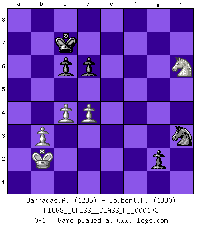 Last move : 0-1 2016 February 23 5:9:21 [Event "FICGS__CHESS__CLASS_F__000173"] [Site "FICGS"] [Date "2016.02.05"] [Round "1"] [White "Barradas,Anderson"] [Black "Joubert,Hennie"] [Result "0-1"] [WhiteElo "1295"] [BlackElo "1330"] 1.e4 c5 2.Nf3 e6 3.d4 cxd4 4.Nxd4 Nf6 5.Nc3 Qb6 6.Be2 Bc5 7.Be3 Nc6 8.Nxc6 Bxe3 9.fxe3 bxc6 10.Qd3 a5 11.O-O-O Ba6 12.Qd4 Qxd4 13.exd4 Bxe2 14.Nxe2 Nxe4 15.Rhf1 f5 16.h3 Rb8 17.Nf4 g5 18.Nh5 Ke7 19.Rde1 Rb7 20.g4 Rf8 21.gxf5 exf5 22.Ng7 Kd8 23.Nxf5 Nf6 24.Nd6 Rb8 25.c3 Kc7 26.Rf5 h6 27.Nc4 a4 28.Kc2 Nd5 29.Rxf8 Rxf8 30.Ne5 Rf2+ 31.Kb1 Rh2 32.c4 Nf4 33.Re3 Rxh3 34.Rxh3 Nxh3 35.b3 axb3 36.axb3 d6 37.Nf7 g4 38.Nxh6 g3 39.Kb2 g2 0-1 Sicilian : Anderssen variation Queenside Castling by player White (move 11) 10 pieces endgame at move 38 : White KNPPP , Black KNPPP WHITE : King + 1 Knight 3 Pawns BLACK : King + 1 Knight 3 Pawns Player Black won this chess game. Follow this game move after move (download)A Chess game is a dialogue, a conversation between a player and his opponent. Each move by the opponent may contain threats or be a blunder, but a player cannot defend against threats or take advantage of blunders if he does not first ask himself: What is my opponent planning after each move ? (Bruce A. Moon) Mein Gehirn das ist mein zweitwichtigstes Organ [Aus dem Film: Der Schläfer]. (Woody Allen) Preferería tener un Peón que un dedo. (Reuben Fine) Les échecs sont un jeu terrible. Si vous n'avez pas le centre, votre adversaire a une position plus libre. Par contre, si vous avez le centre, alors vous avez vraiment quelque chose pour laquelle vous inquiéter ! (Siegbert Tarrasch) The man who strikes first admits that his ideas have given out. (Chinese proverb)