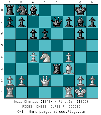 Last move : 0-1 2007 April 24 9:17:32 [Event "FICGS__CHESS__CLASS_F__000030"] [Site "FICGS"] [Date "2007.03.20"] [Round "1"] [White "Neil,Charlie"] [Black "Aird,Ian"] [Result "0-1"] [WhiteElo "1242"] [BlackElo "1200"] 1.d4 Nf6 2.Nf3 g6 3.c4 Bg7 4.Nc3 O-O 5.e4 d6 6.Be2 c6 7.O-O e5 8.Be3 exd4 9.Nxd4 Re8 10.f4 Nxe4 11.Nxe4 Rxe4 12.Qd2 Qe7 13.Bf3 Rxe3 0-1 King's Indian : East Indian defense Kingside Castling by player Black (move 4) Kingside Castling by player White (move 7) Player Black won this chess game. Follow this game move after move (download)Chess is above all, a fight ! (Emanuel Lasker) Wenn Schach ein enormer Dschungel ist, der seine Myriaden von Geheimnissen nicht preisgeben will, dann sind Computer die Kettensägen einer gewaltigen ökologisch unsensiblen Nutzholzfirma. (Nigel Short) Una mala movida nulifica cuarenta buenas. (Horowitz) Le profane ne songe pas à la somme de jouissance dont il se prive, qui méconnaît ce jeu aux ressources aussi variées que passionnantes. (Jean-Marie Jeanton-Lamarche) Never risk one's whole fortune unless supported by one's entire army. (Niccolo Machiavelli)