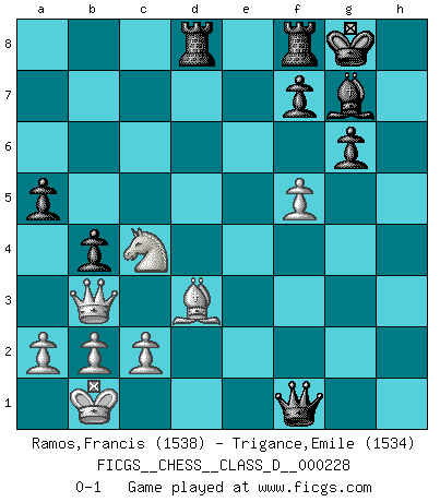 Last move : 0-1 2016 February 17 17:8:16 [Event "FICGS__CHESS__CLASS_D__000228"] [Site "FICGS"] [Date "2016.02.06"] [Round "1"] [White "Ramos,Francis"] [Black "Trigance,Emile"] [Result "0-1"] [WhiteElo "1538"] [BlackElo "1534"] 1.e4 c5 2.Nf3 d6 3.d4 cxd4 4.Nxd4 Nf6 5.Nc3 g6 6.Be3 Bg7 7.Qd2 Ng4 8.O-O-O Nxe3 9.Qxe3 Nc6 10.Nb3 Bd7 11.Kb1 O-O 12.f4 Na5 13.Nd5 Nxb3 14.Qxb3 e6 15.Ne3 Qc7 16.g4 b5 17.h4 a5 18.h5 Bc6 19.hxg6 hxg6 20.Bg2 b4 21.Nc4 d5 22.exd5 Bxd5 23.Rxd5 exd5 24.Bxd5 Rad8 25.Be4 Qd7 26.Bd3 Qxg4 27.f5 Qf3 28.Rf1 Qxf1+ 0-1 Sicilian : Dragon, 6.Be3 Queenside Castling by player White (move 8) Kingside Castling by player Black (move 11) Player Black won this chess game. Follow this game move after move (download)My style is somewhere between that of Tal and Petrosian. (Reshevsky) Die Partien sind immer verschieden, die Interviews immer die gleichen. (Garry Kasparov) El Ajedrez es un cuento de Hadas de las 1001 metidas de pata. (Savielly Tartakower) Si je n'étais pas joueur d'échecs, je serais le meilleur dans quelque chose d'autre. (Anatoli Karpov) Men should grow up. - Yeah. And dogs should stop licking themselves. It's not gonna happen. (Gregory House to Dr. Cameron, House M.D.)
