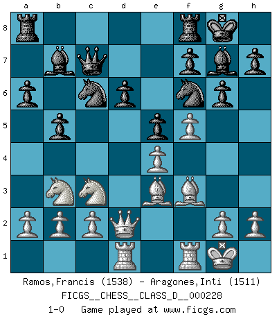 Last move : 1-0 2016 April 20 22:3:17 [Event "FICGS__CHESS__CLASS_D__000228"] [Site "FICGS"] [Date "2016.02.06"] [Round "1"] [White "Ramos,Francis"] [Black "Aragones,Inti"] [Result "1-0"] [WhiteElo "1538"] [BlackElo "1511"] 1.e4 c5 2.Nf3 d6 3.d4 cxd4 4.Nxd4 Nf6 5.Nc3 a6 6.Be3 Nc6 7.Be2 g6 8.O-O Bg7 9.Qd2 O-O 10.f4 e5 11.Nb3 b5 12.Bf3 Bb7 13.Rad1 Qc7 14.f5 1-0 Sicilian : Najdorf, Byrne (English) attack Kingside Castling by player White (move 8) Kingside Castling by player Black (move 9) Player White won this chess game. Follow this game move after move (download)Chess is imagination. (David Bronstein) Über Frauen: Chess is better. (Robert James Fischer) El Rey es una pieza de pelea. ¡Usenlo!. (Wilhelm Steinitz) Aidez vos pièces, elles vous aideront. (Paul Morphy) If you work for a living, why do you kill yourself working ? (Tuco to a chicken in The Good, The Bad and The Ugly)