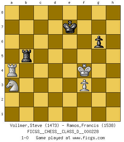 Last move : 1-0 2016 February 25 15:11:55 [Event "FICGS__CHESS__CLASS_D__000228"] [Site "FICGS"] [Date "2016.02.06"] [Round "1"] [White "Vollmer,Steve"] [Black "Ramos,Francis"] [Result "1-0"] [WhiteElo "1473"] [BlackElo "1538"] 1.d4 Nf6 2.c4 g6 3.Nc3 Bg7 4.e4 d6 5.f4 O-O 6.Nf3 c5 7.d5 e6 8.Be2 exd5 9.cxd5 Re8 10.Qc2 a6 11.a4 Nbd7 12.O-O Nf8 13.Kh1 Bg4 14.Be3 Rb8 15.a5 h5 16.Bd3 N8h7 17.Qf2 b5 18.axb6 Rxb6 19.Rfb1 a5 20.Nd2 Rb4 21.Ra4 Qb6 22.Nc4 Rxc4 23.Rxc4 Nd7 24.h3 Ndf6 25.hxg4 Nxg4 26.Qf3 Nhf6 27.Bg1 Rb8 28.e5 dxe5 29.Bxc5 Qb3 30.Bd6 Re8 31.fxe5 Nxe5 32.Bxe5 Rxe5 33.Nb5 Nxd5 34.Rc8+ Bf8 35.Bxg6 Qxf3 36.gxf3 fxg6 37.Nc3 Ne7 38.Ra8 Kf7 39.Rd1 h4 40.Ne4 Bh6 41.Rd6 h3 42.Rh8 Kg7 43.R6d8 Nf5 44.Rhe8 Ne7 45.Rd7 Kf7 46.Nd6+ Kf6 47.Kh2 Bf4+ 48.Kxh3 Re2 49.Ne4+ Kf5 50.Rf8+ Ke6 51.Rxe7+ Kxe7 52.Rxf4 Rxb2 53.Rf6 Rb3 54.Kg4 a4 55.Ra6 a3 56.Ra4 Rd3 57.Kf4 Rb3 58.Nd2 Rb2 59.Nc4 Rb5 60.Nxa3 1-0 King's Indian : Four pawns attack, dynamic line Kingside Castling by player Black (move 5) Kingside Castling by player White (move 12) 10 pieces endgame at move 51 : White KRNPP , Black KRBPP WHITE : King + 1 Rook 1 Knight 2 Pawns BLACK : King + 1 Rook 1 Bishop 2 Pawns 9 pieces endgame at move 52 : White KRNPP , Black KRPP WHITE : King + 1 Rook 1 Knight 2 Pawns BLACK : King + 1 Rook 2 Pawns 8 pieces endgame at move 52 : White KRNP , Black KRPP WHITE : King + 1 Rook 1 Knight 1 Pawn BLACK : King + 1 Rook 2 Pawns 7 pieces endgame at move 60 : White KRNP , Black KRP WHITE : King + 1 Rook 1 Knight 1 Pawn BLACK : King + 1 Rook 1 Pawn Player White won this chess game. Follow this game move after move (download)Before the endgame, the Gods have placed the middle game. (Siegbert Tarrasch) Die starken Figuren des Gegners muss man abtauschen. (José Raúl Capablanca) El Ajedrez demanda una total concentración. (Bobby Fischer) Tout change constamment, y compris dans le monde des Echecs. (Botvinnik) Perhaps chess is the wrong game for the times (The Chess Master and the Computer, by Garry Kasparov - 2010)