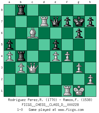 Last move : 1-0 2016 April 17 15:41:30 [Event "FICGS__CHESS__CLASS_D__000228"] [Site "FICGS"] [Date "2016.02.06"] [Round "1"] [White "Rodriguez Perez,Rene"] [Black "Ramos,Francis"] [Result "1-0"] [WhiteElo "1770"] [BlackElo "1538"] 1.e4 c5 2.Nf3 d6 3.d4 cxd4 4.Qxd4 a6 5.Nc3 Nc6 6.Qa4 Bd7 7.Qb3 b5 8.a4 b4 9.Nd5 a5 10.Bb5 e6 11.Qe3 Nge7 12.Nb6 Rb8 13.Nxd7 Qxd7 14.b3 Ng6 15.Nd4 Nge7 16.c3 g6 17.cxb4 Bg7 18.Bb2 O-O 19.Nxc6 Nxc6 20.Bxg7 Kxg7 21.Qc3+ e5 22.Bxc6 Qg4 23.O-O Rxb4 24.Rad1 Rfb8 25.Rxd6 Qf4 26.g3 Qg5 27.f4 Qe7 28.Rd7 1-0 Sicilian, Chekhover variation Kingside Castling by player Black (move 18) Kingside Castling by player White (move 23) Player White won this chess game. Follow this game move after move (download)At this time Fischer is simply a level above all the best Chessplayers in the world. (John Jacobs) Im Schach gibt es keinen Platz für Galanterie. (Irving Chernev) No es una movida, aún la mejor movida que tu debas buscar, sino un plan comprensible. (Eugene Znosko-Borovsky) La solitude du joueur d'Echecs à l'approche du mat est semblable à celle du condamné. (Francis Szpiner) Whoever said the pen is mightier than the sword obviously never encountered automatic weapons. (US General Douglas MacArthur)